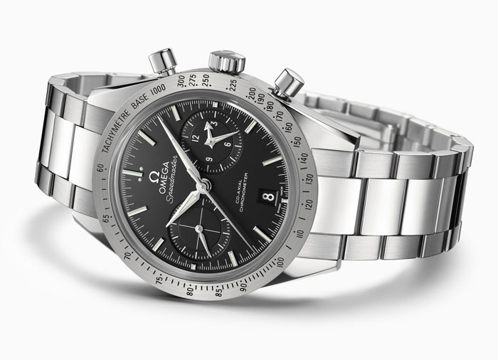 La colección Speedmaster ’57 está equipada con los primeros calibres Co-Axial –producidos enteramente en los talleres de OMEGA– en incorporar una función de cronógrafo, que además incorpora un mecanismo de rueda de pilares y presenta dos totalizadores, contador de 12 horas y de 60 minutos en la misma subcarátula, situada a las 3. Esta disposición de las agujas, tan familiar que recuerda la de las de horas y minutos de la carátula principal, permite una lectura intuitiva del cronógrafo. La trotadora central destaca por su excelente lectura, mientras que la fecha a parece mediante una apertura a las 6 horas. Los dos pulsadores de cronógrafo funcionan de manera independiente, por tanto el mecanismo no corre ningún riesgo resultante de una manipulación involuntaria.