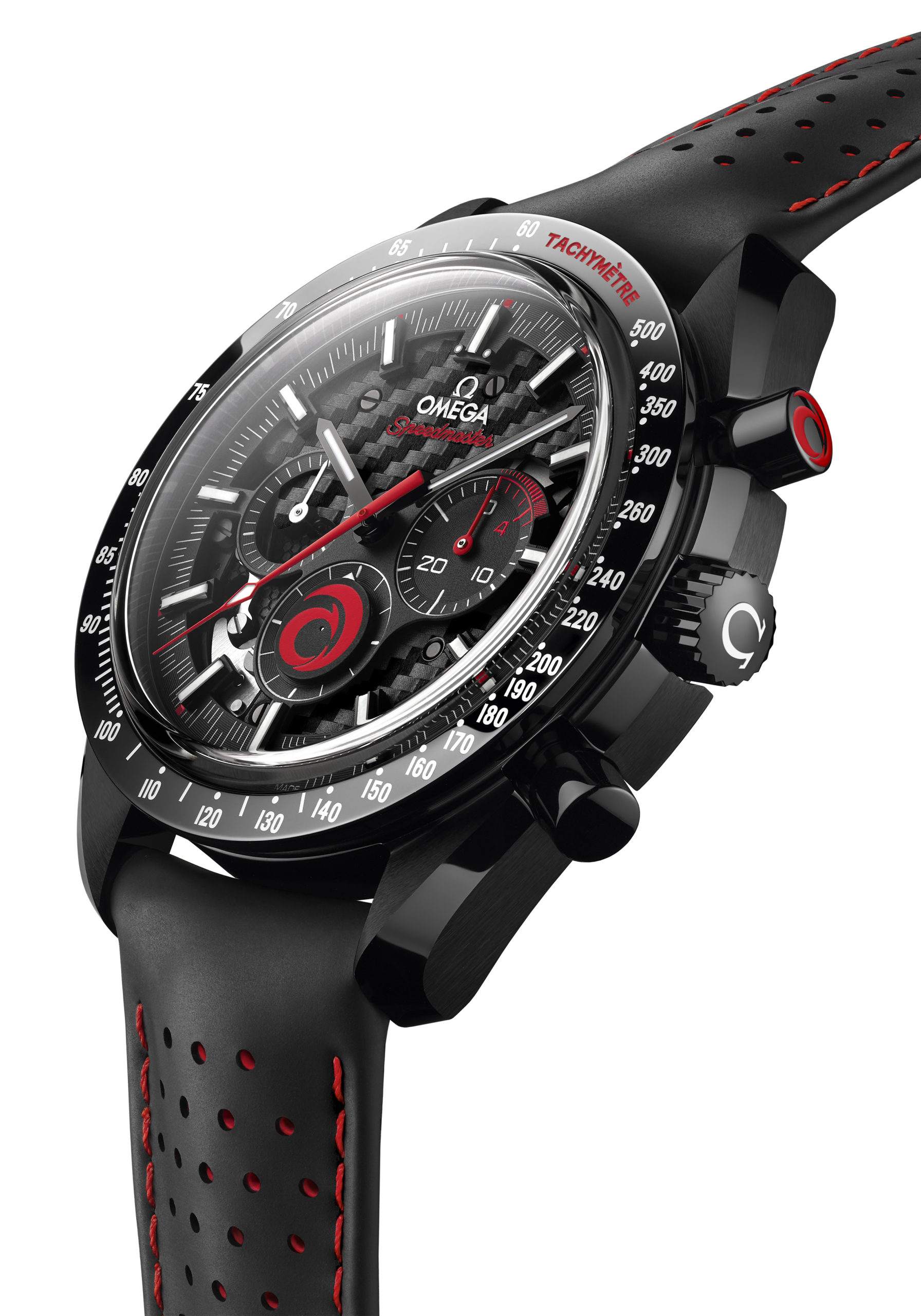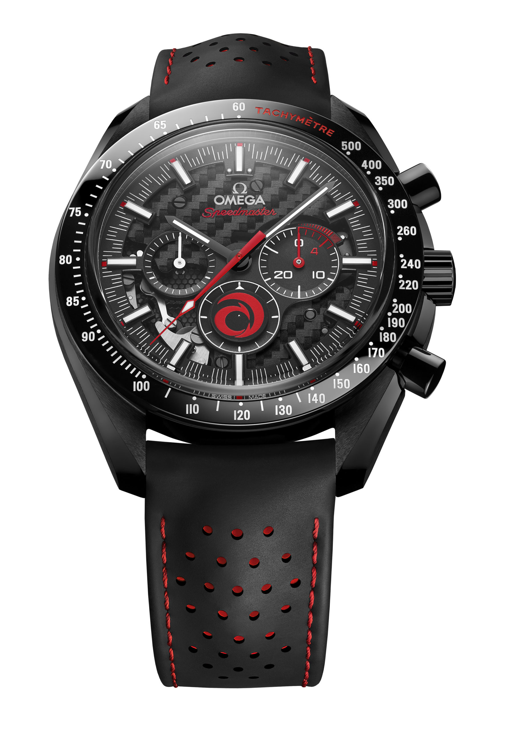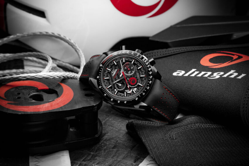 Omega ha combinado el reloj con el logotipo de Alinghi, que incluye el rojo para representar la pasión y el negro para la tecnología. Esto se puede ver a través de características como la correa de caucho perforado en contraste negra con roja, así como la caja de 44.25 mm en cerámica de óxido de circonio negro. Junto con una escala de taquímetro en Super-LumiNova®, el diseño externo también es notable por el logotipo de Alinghi en el pulsador de start–stop, que se ha creado en barniz rojo.