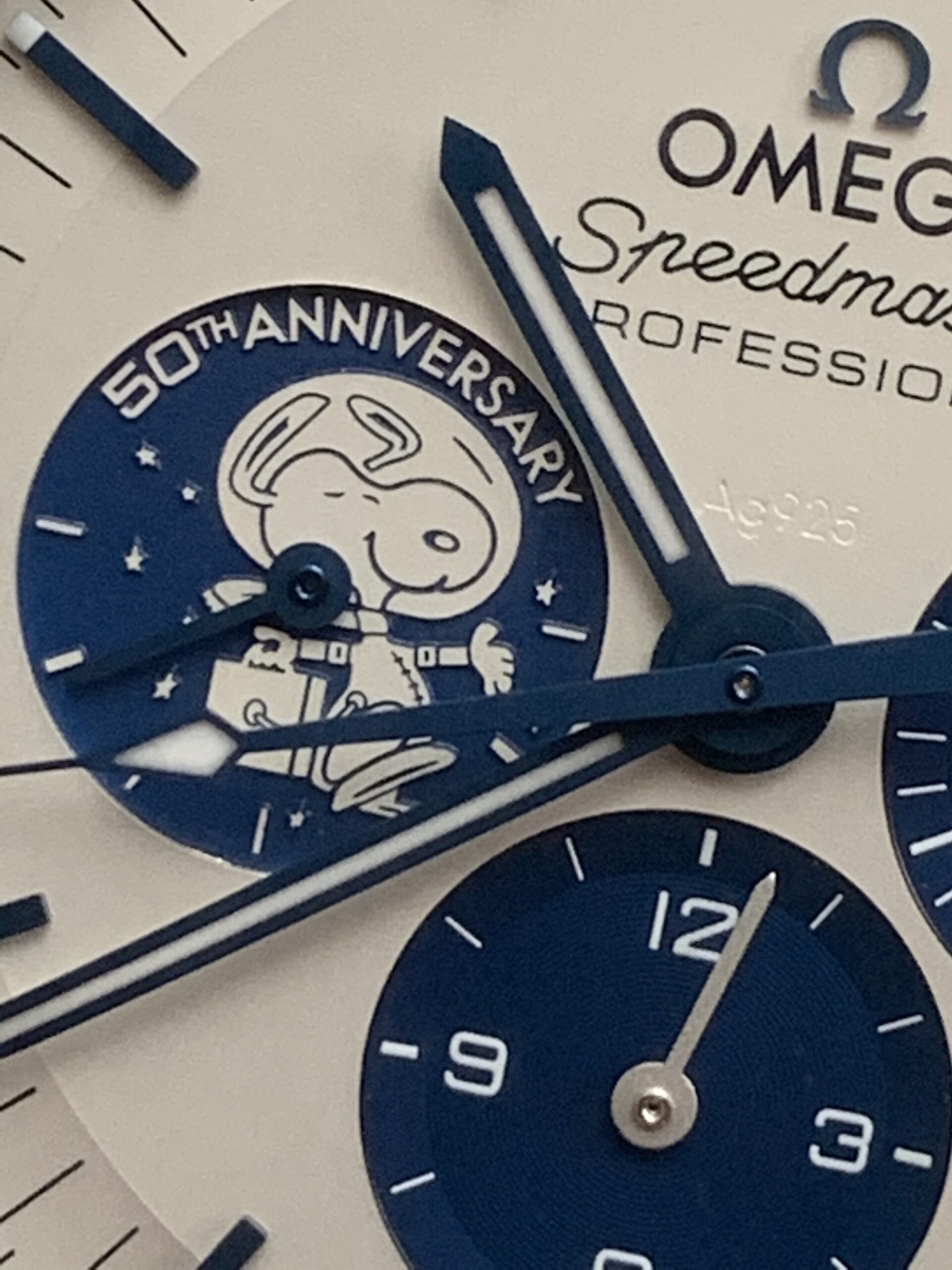 Sin duda, este es uno de los años más importantes para esta pieza. Ahí estaba en sus colores en combinación a la vista básicamente blanco y azul, su esfera de plata muy “ad-hoc” a su aniversario, contadores y taquímetro exterior en azul y remata su gran figura de Snoopy –también en plata– que se ha colocado en el contador de las nueve horas con la leyenda “50th anniversary”. Por fin, a la lupa y en nuestras manos, descubrimos lo que en fotos nunca pudimos ver, sus grandes acabados, el tacto del reloj y su correa que lleva en exterior textil y en el interior, piel, donde por cierto en la parte trasera lleva grabada la trayectoria de la cápsula espacial en su viaje y de regreso. Su extraordinaria carátula en plata que remata al centro con el símbolo del material imperceptible con un simple vistazo, pero al descubrirlo conquista.