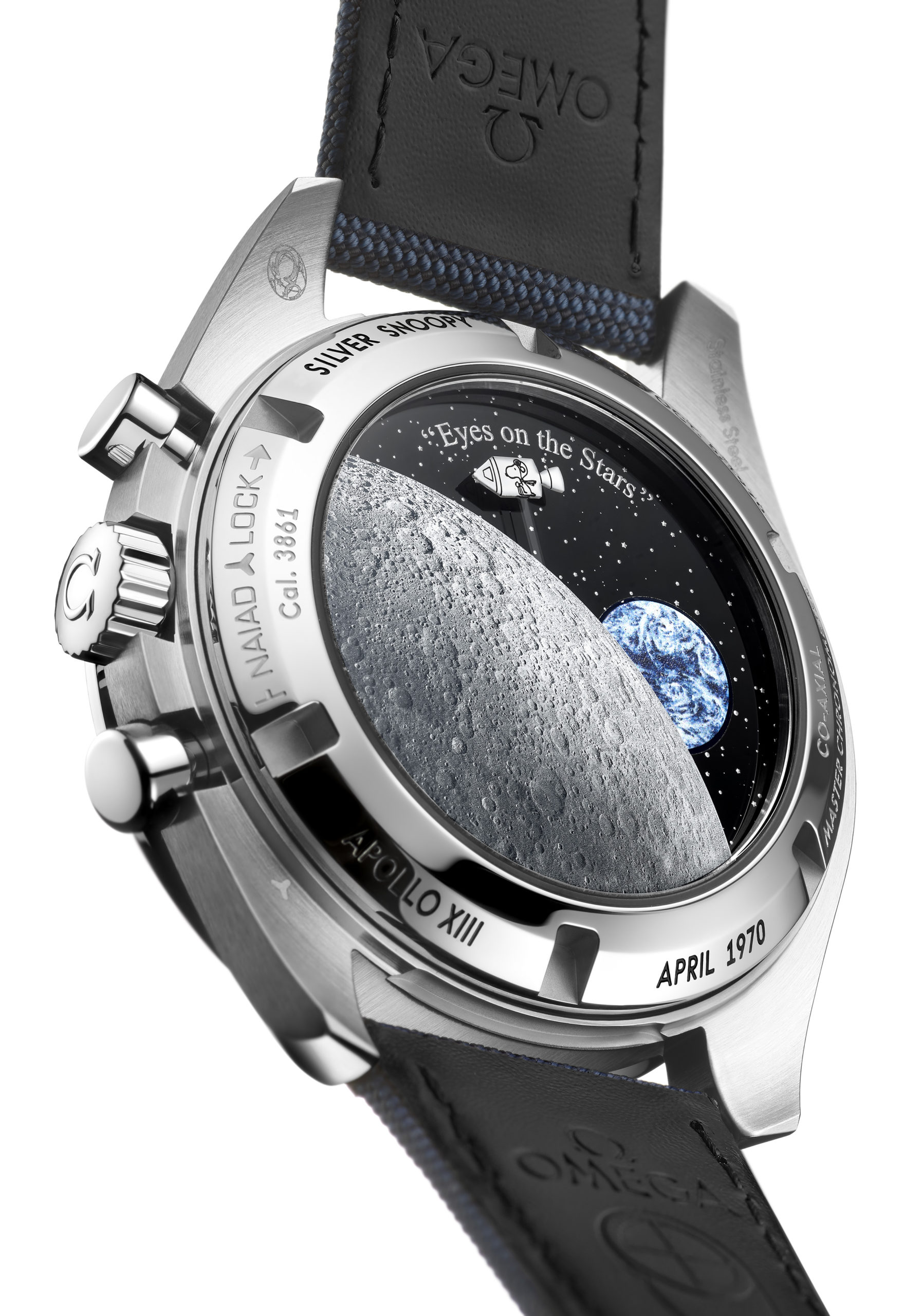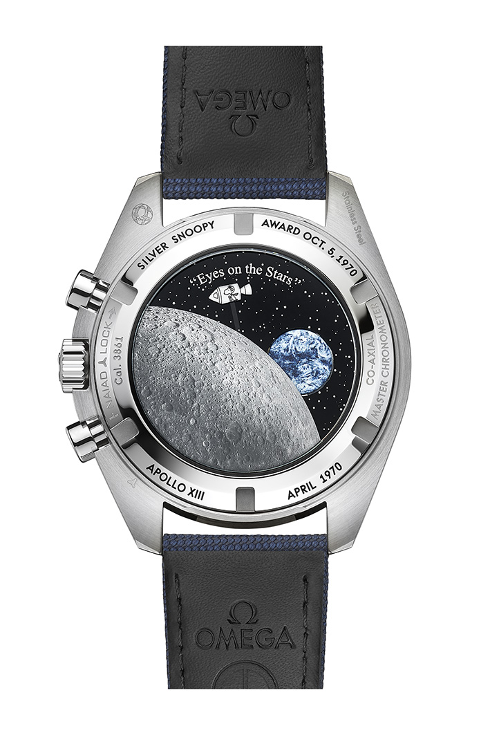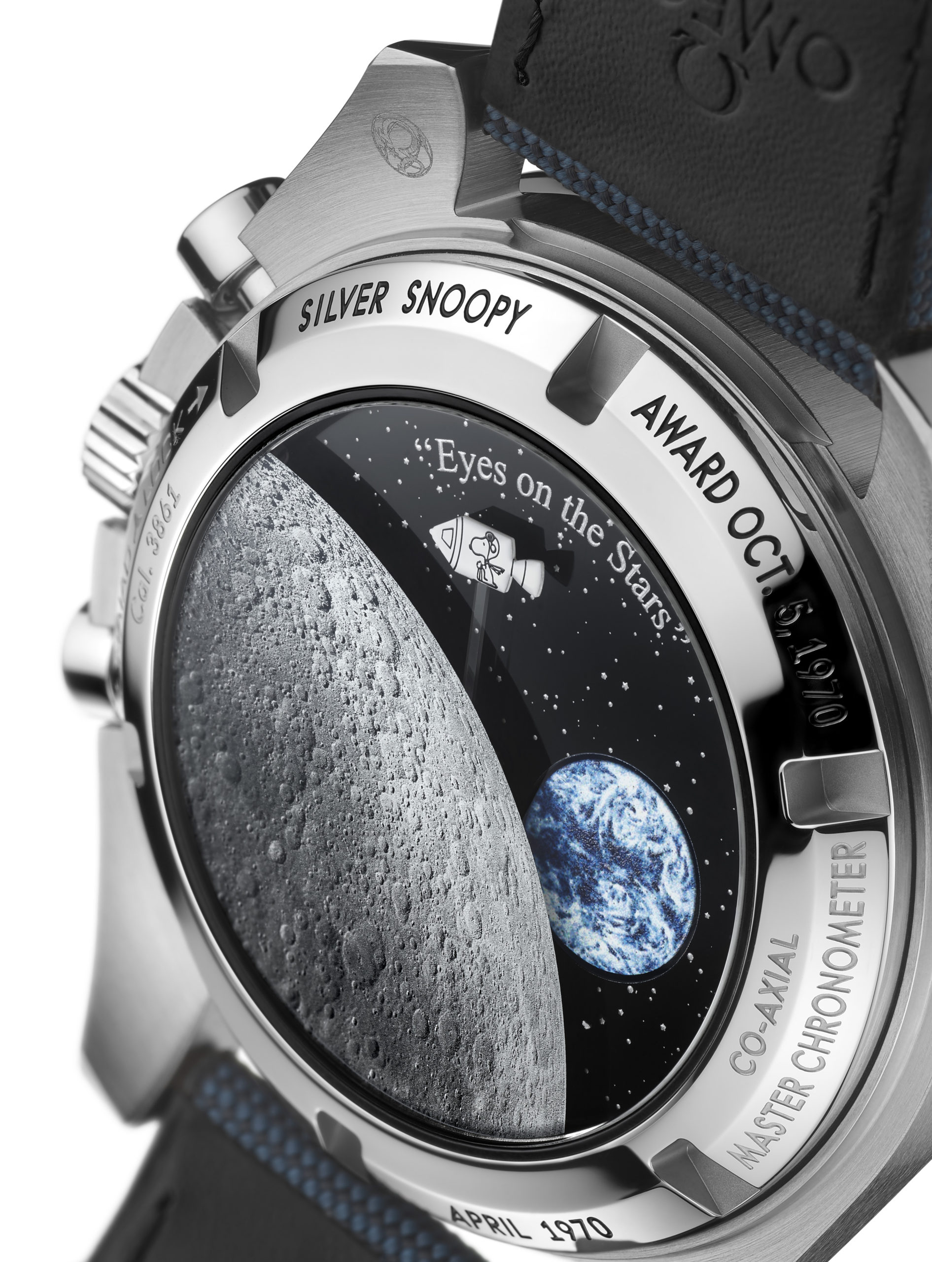 Snoopy juega un papel central en el reloj apareciendo –por primera ocasión– en en la subcarátula de las 9 horas de manera protagonista mediante un medallón de plata en relieve, en homenaje al pin dado por la NASA a Omega. La carátula de plata Ag925 está grabada a láser con totalizadores de minutos y horas en color azul con tratamiento PVD.