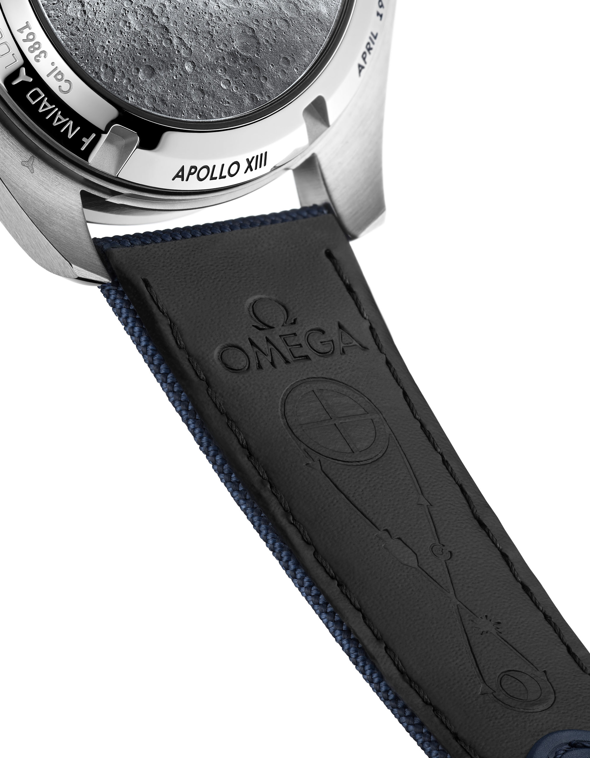 El strap de tela de nylon azul combina con los otros elementos del reloj, e incluso presenta la trayectoria de la misión Apolo 13, en relieve en el forro. Esta correa está unida a una caja de 42 mm en acero inoxidable, que está inspirada en el estilo Speedmaster de cuarta generación (el primer reloj usado en la luna en 1969). La escala taquimétrica se presenta en esmalte blanco sobre un anillo de bisel de cerámica azul [ZrO2].
