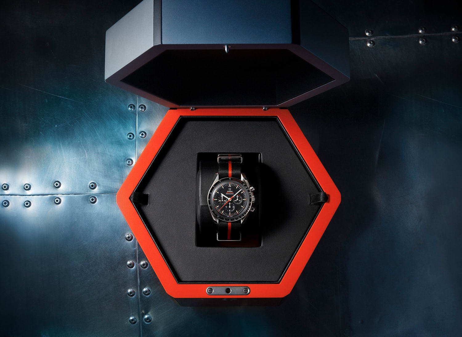 La pieza se presenta en caja de acero inoxidable y cristal hesalite, tal como era construido el icono de la década de los sesenta. Además, presenta una correa de cuero pespuntada en color naranja y una pulsera de NATO a juego. El bisel es de aluminio anodizado, mientras que el fondo luce los grabados de #SpeedyTuesday con la frase: The First Watch Worn On The Moon”.