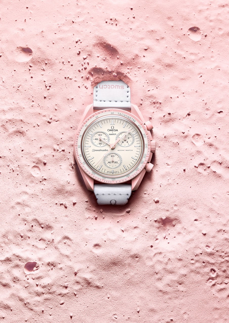 El diseño, sorprenderá hasta a los más fanáticos de Omega porque podrían jurar que se trata de un Speedmaster, sin embargo, los colores como el rosa y el azul pálido representan la esencia de Swatch.