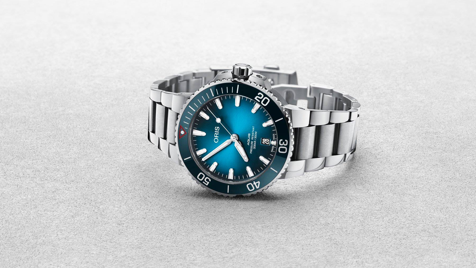 Desarrollada a partir de un Aquis Date tradicional, la caja se extiende hasta los 39.5 mm de diámetro y está desarrollada en acero inoxidable junto con el brazalete. La carátula presenta una tonalidad de azules en graduación que representan la profundidad del océano y a juego con el bisel. Es hermética hasta los 300 metros y cuenta con un sistema de cierre patentado que puede ajustarse de manera práctica dentro del agua para asegurar su posición en la muñeca. El calibre es un Oris 733 (SW-200-1) dotado de 38 horas de reserva de marcha a 4 Hz.