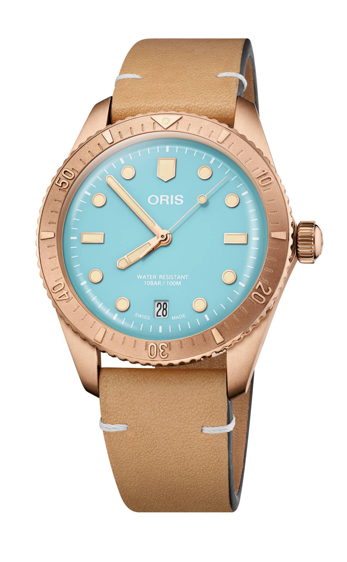 Oris seleccionó el calibre mecánico automático Oris 733 (base Sellita SW200-1). La reserva de marcha de 38 horas a una frecuencia de pulsación de 28.800 a/hora. En cuanto al strap, la primera opción es la versión de la marca del clásico brazalete estilo ostra de tres eslabones en bronce, con un revestimiento especial para evitar el contacto de la pátina de bronce con la piel del usuario. Para aquellos que prefieren el cuero, Oris también combina las tres variantes con una correa de cuero marrón claro con costuras blancas en contraste.