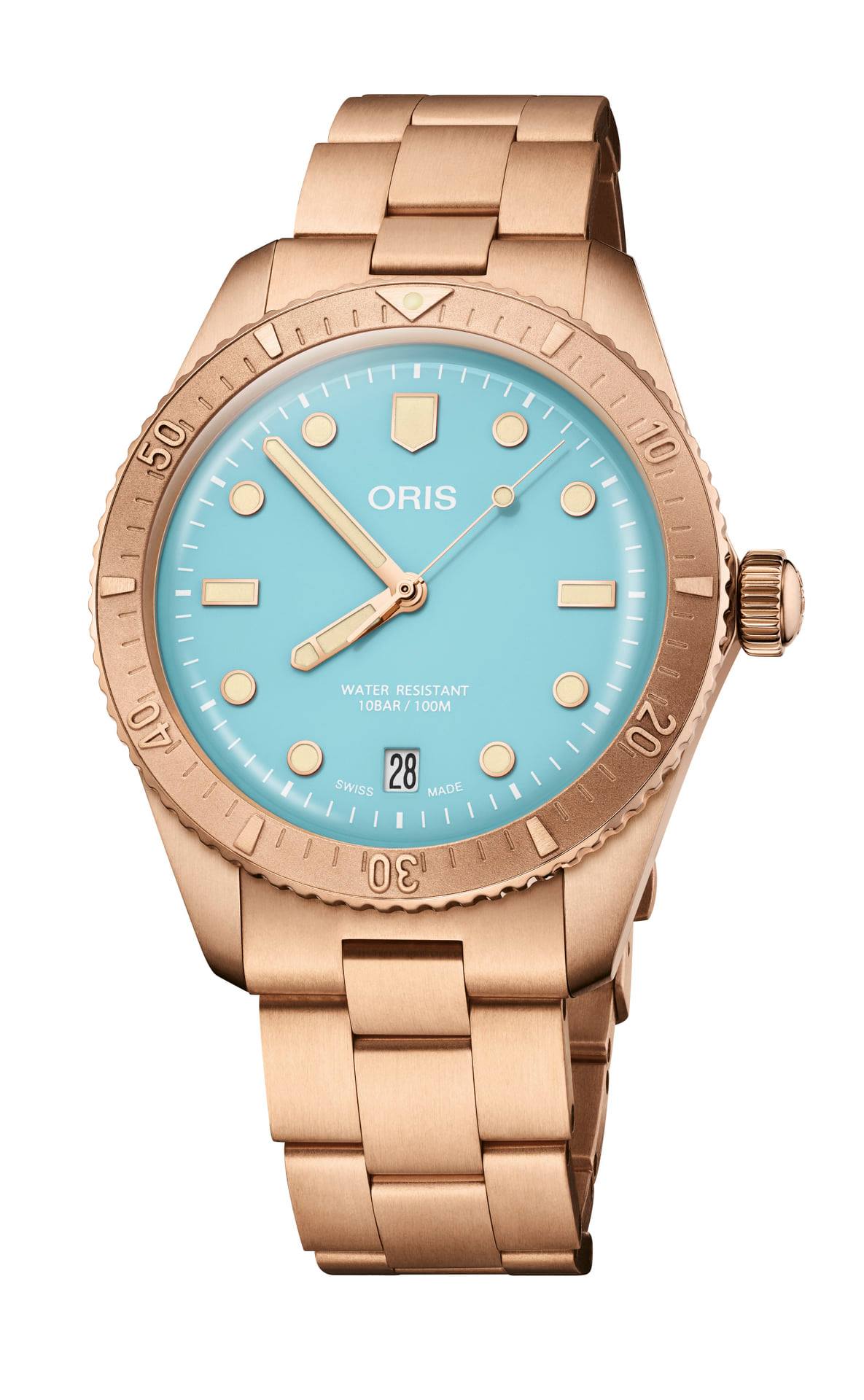 Las cajas de bronce se combinan tradicionalmente con tonos de carátula oscuros y muy masculinos, y al combinar este atrevido material náutico con delicados colores pastel, replantea visualmente los diseños del dial y la caja. En verde salvaje, azul cielo y un rosa labial, la mezcla de índices de buzo aplicados y agujas tipo bastón adquiere un carácter nuevo y más claro.