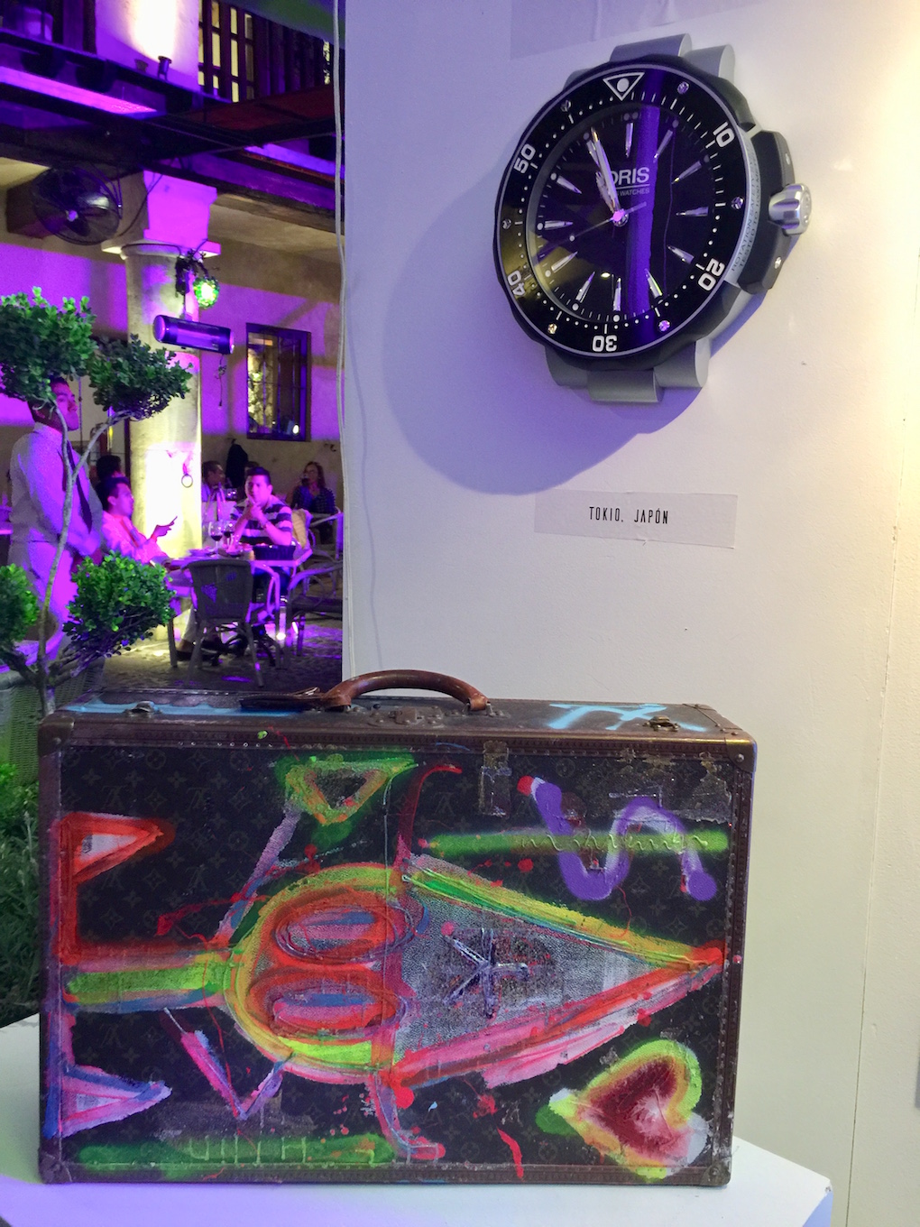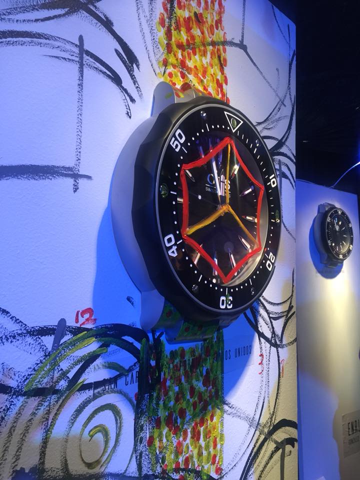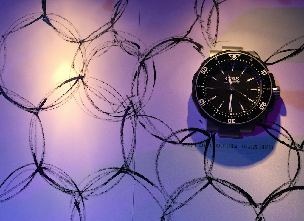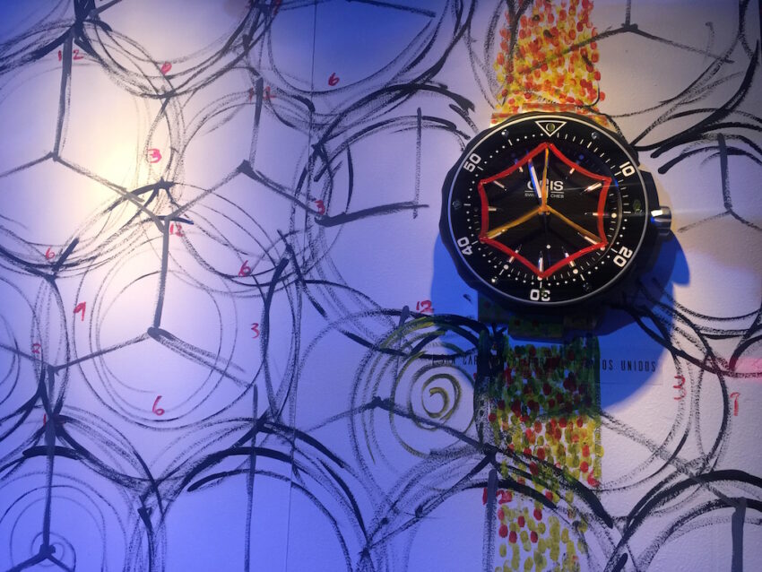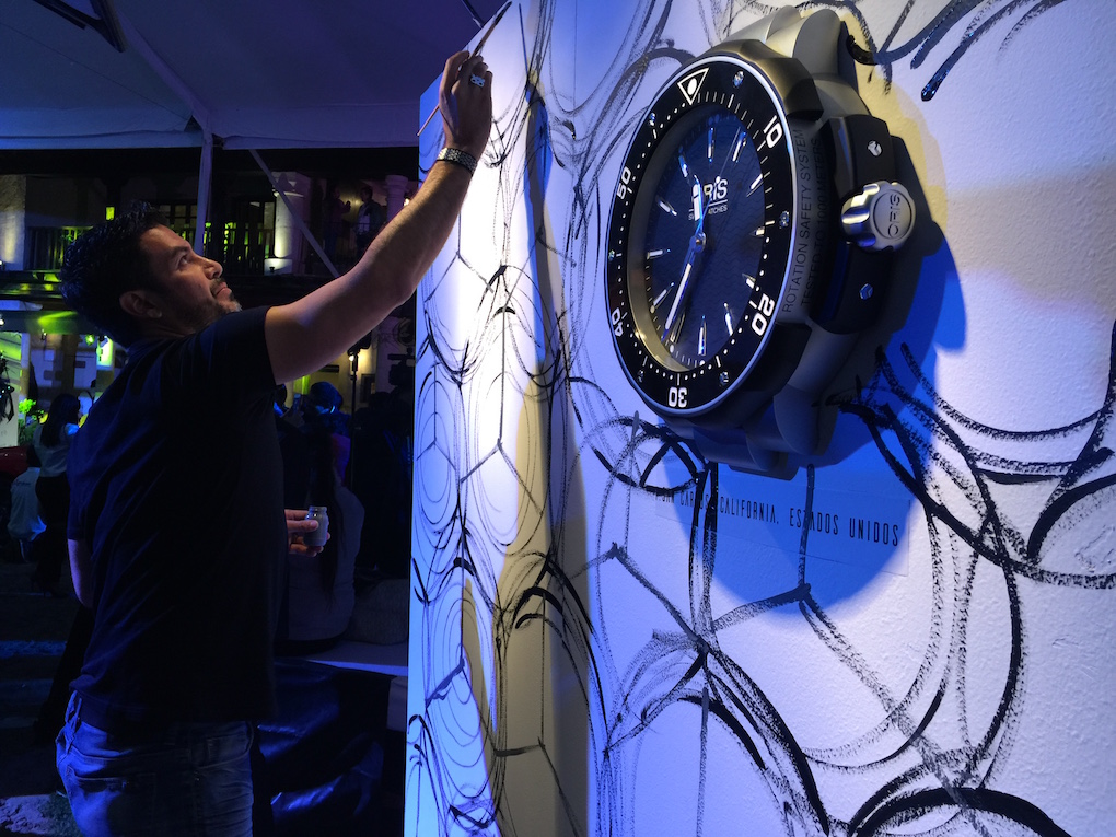 El momento estelar se hizo notar cuando el pintor mexicano Álvaro Cuevas, comenzó a intervenir en uno de los relojes Oris empotrados en la pared, en el que representó el pasado, presente y futuro de las culturas a través de figuras geométricas.
