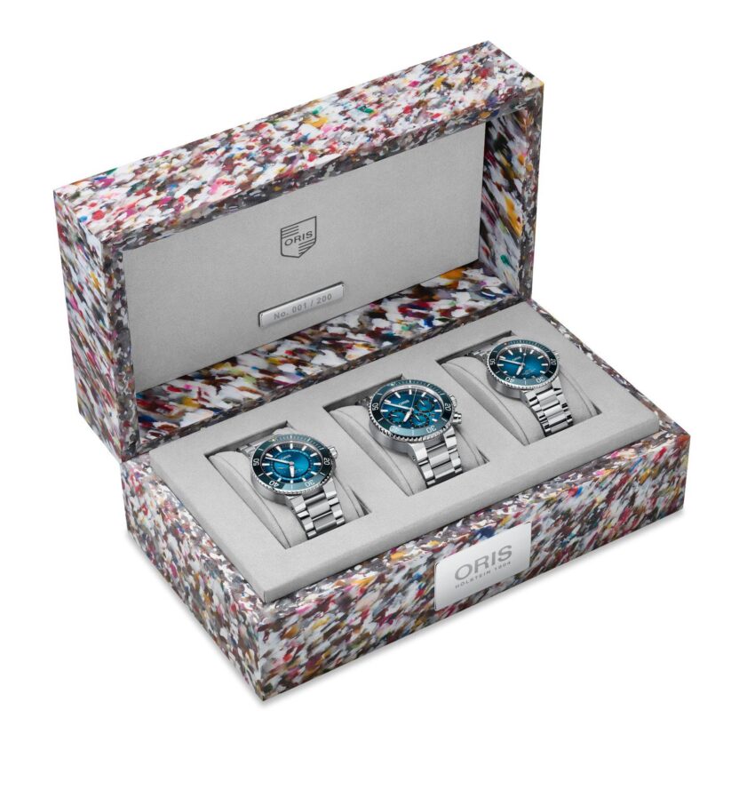 Oris Ocean Trilogy apoya un trío de proyectos vitales para la salud de nuestros océanos. Está limitado a 200 piezas y se presenta en un estuche especial de plástico PET reciclado.