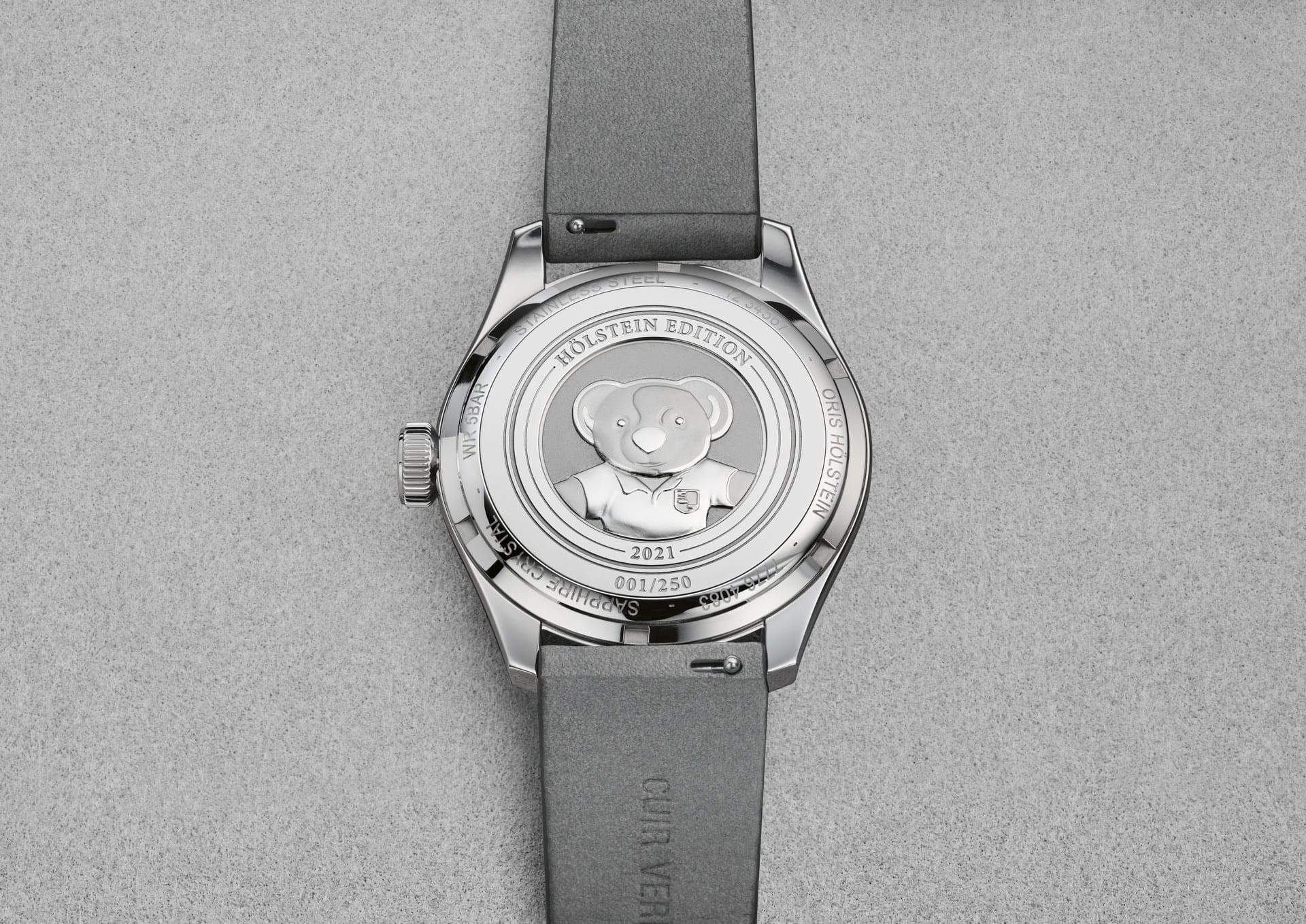 - Caja: 38 mm de acero inoxidable con acabado pulido; cristal de zafiro abovedado con tratamiento antirreflejos y fondo sólido grabado de acero inoxidable con el Oso de Oris y la numeración