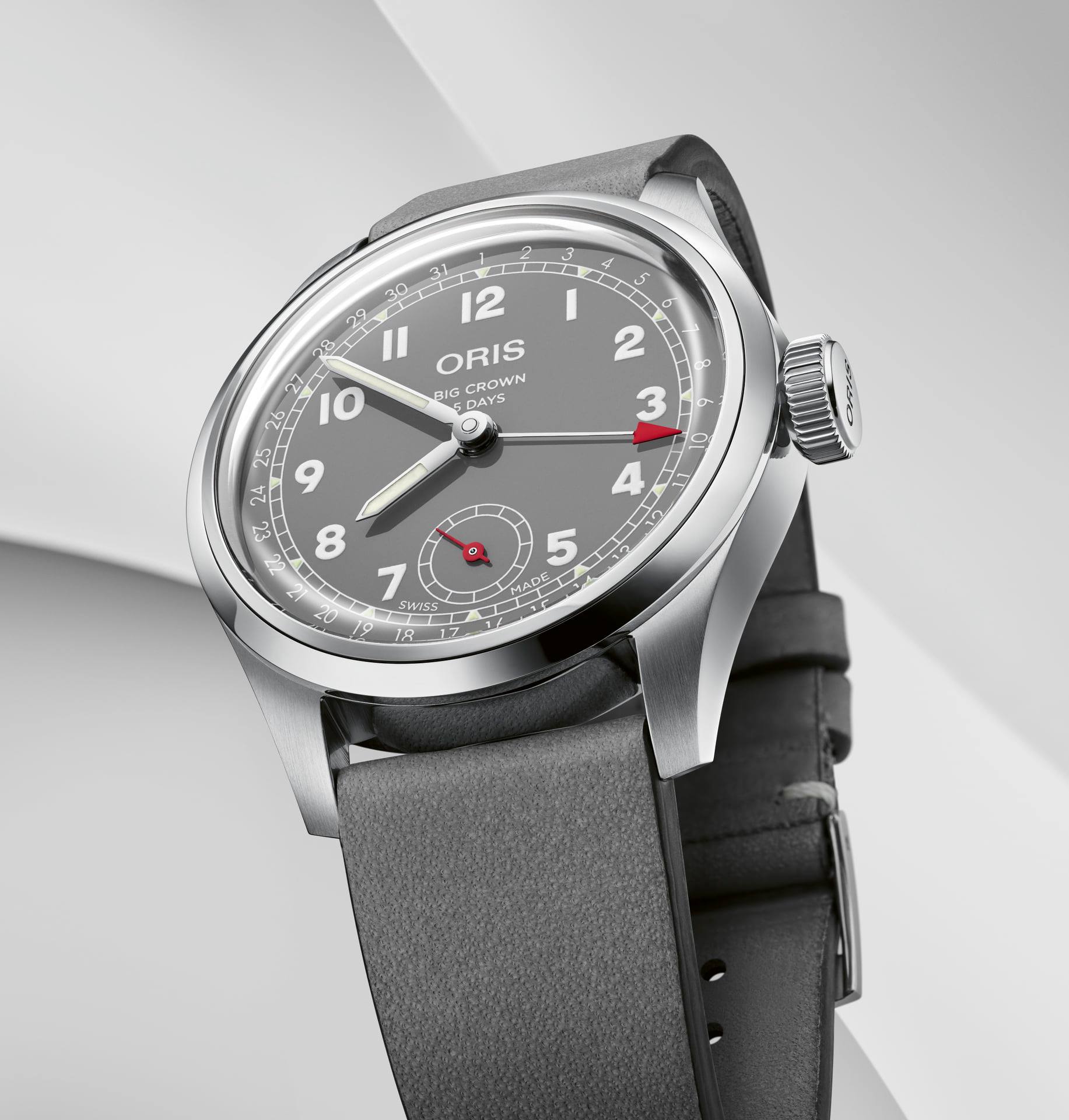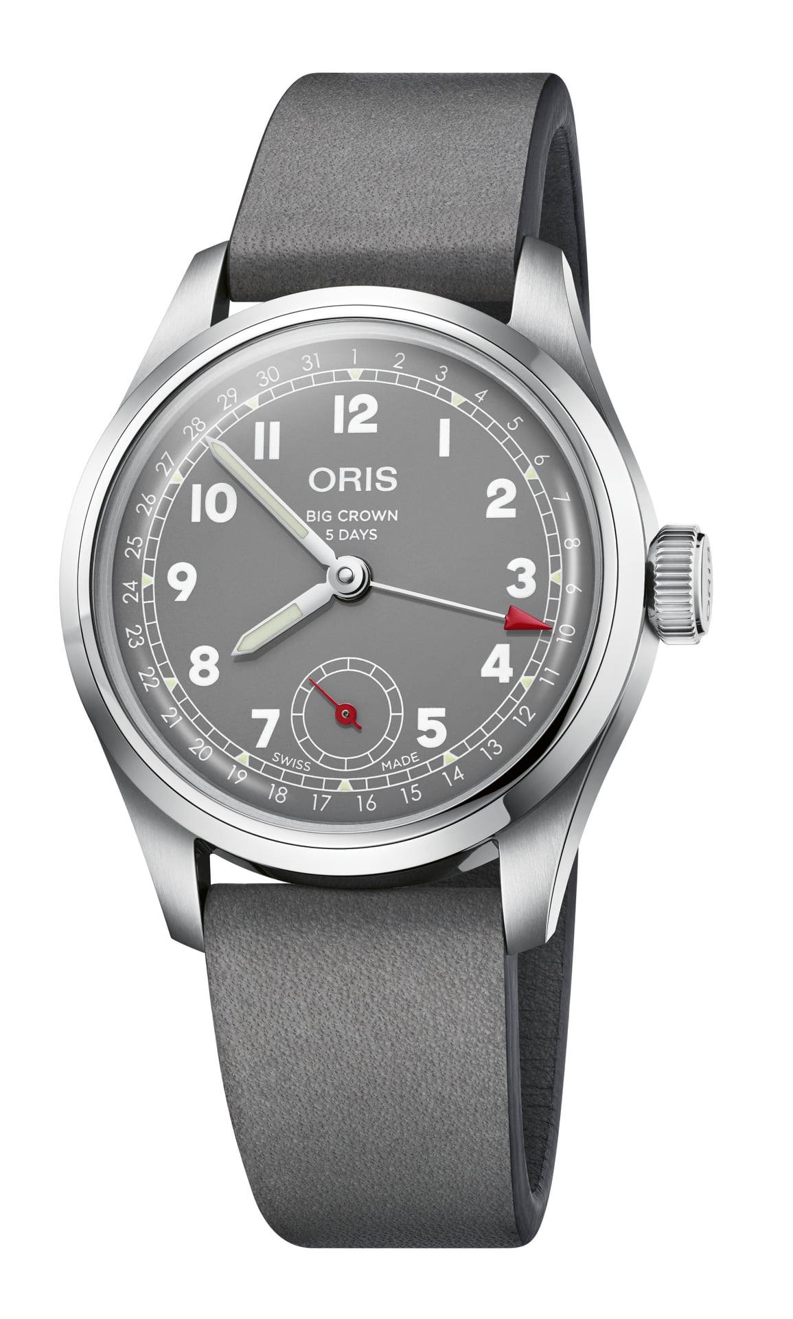Su versatilidad y ejecución modular permitieron la eliminación del fechador por disco (Calibre 400), agregando la tradicional fecha por aguja de los Big Crown. Adicionalmente, el segundero se ubica a las 6, bellamente destacado por una aguja en color rojo.