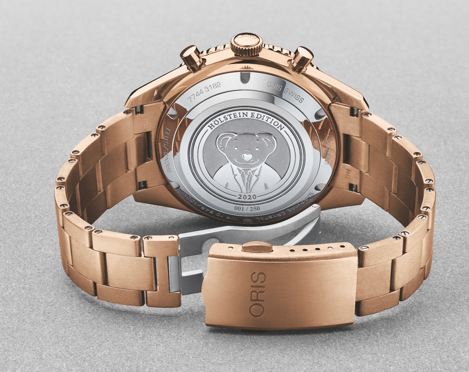 Para la carátula se utilizó una chapa de oro rosa que va a juego con los índices. Lo cual destaca por completo el look monocromático de la pieza. Asimismo, el fondo luce un grabado excepcional, se trata del famoso Oso Oris, que se ha convertido en símbolo del espíritu de la marca con un sentido “cálido y honesto”.