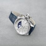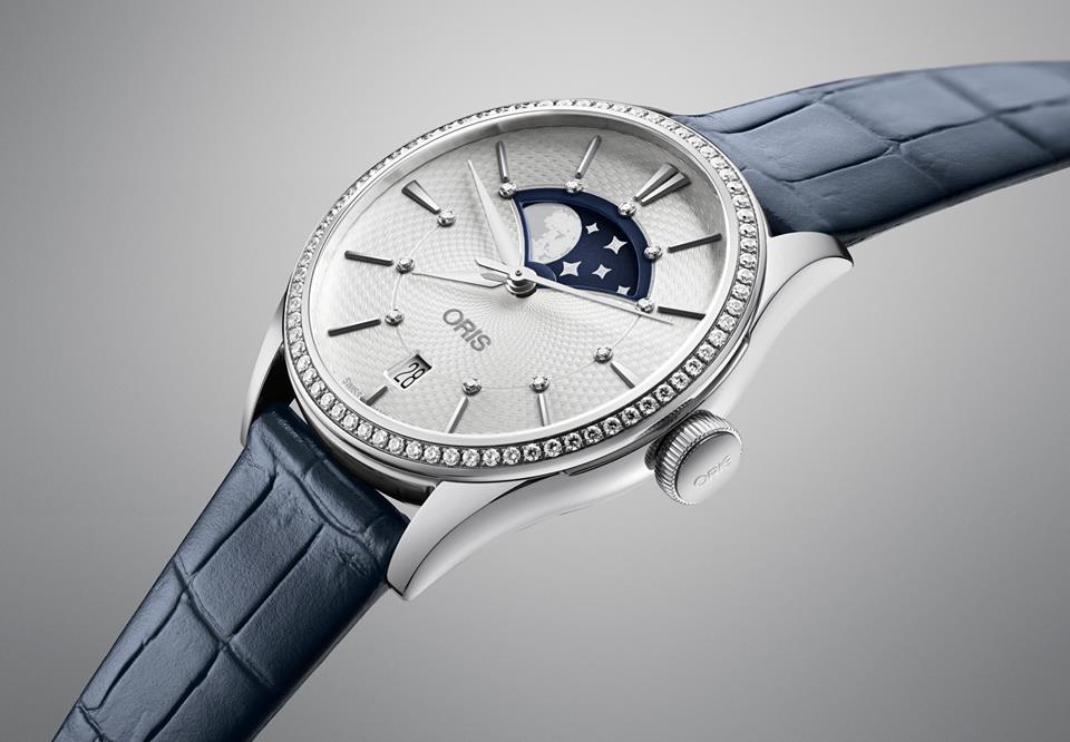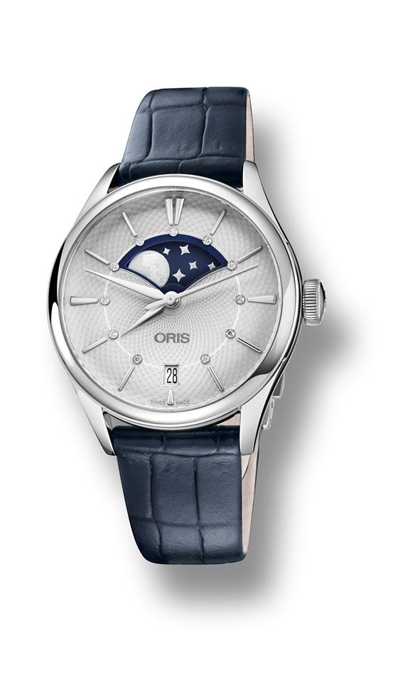 Es el primer reloj femenino de la marca que presenta una indicación de fase de Luna, mientras que la caja destaca por la elegancia y atemporalidad del conjunto, que se embellece con una carátula con decoración guilloché y mediante 11 índices diamantes que complementan a 72 minerales más engastados al bisel en la versión más exclusiva. Al interior de la pieza late el calibre 763, cuyo módulo de complicación Lunar ha sido diseñado por Oris. Finalmente, dos configuraciones están disponibles: caja de acero con brazalete inoxidable a juego, o correa de piel azul con bisel engastado.