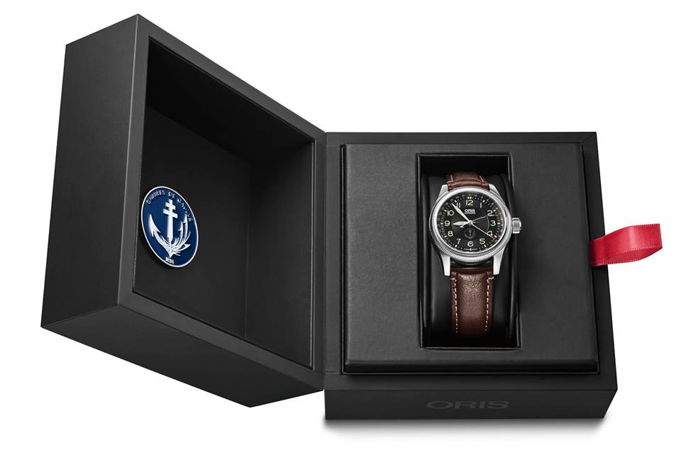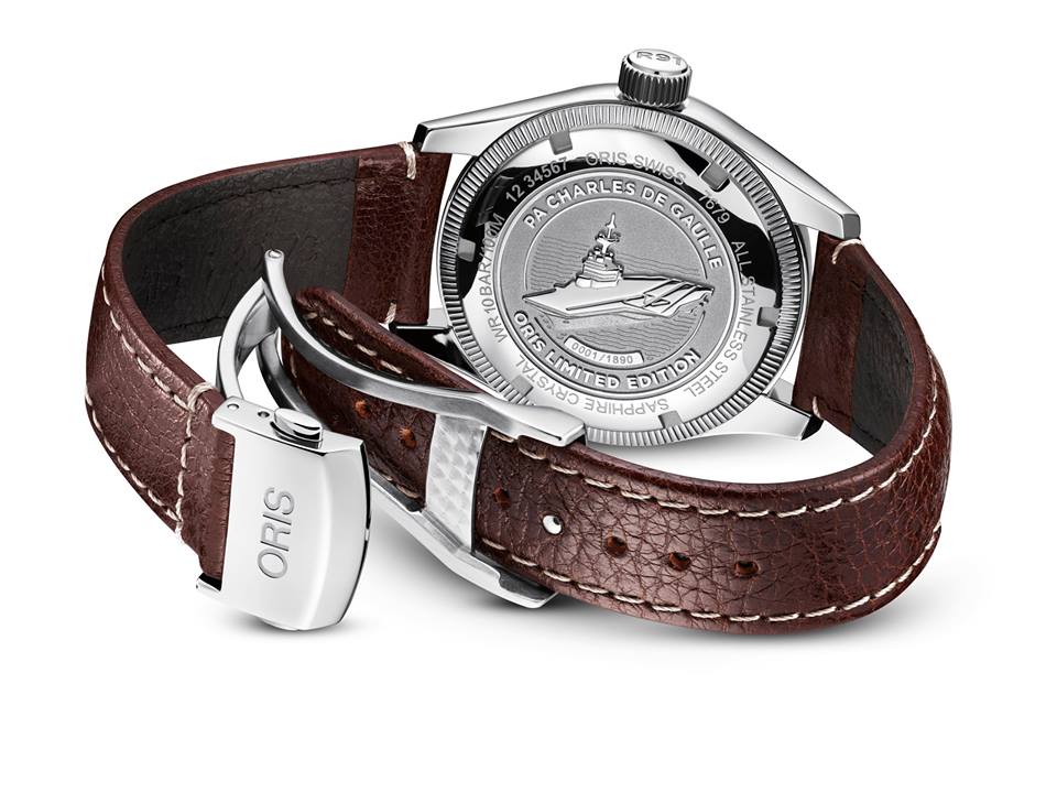 La caja está construida en acero inoxidable, cuenta con un bisel estriado y corona sobredimensionada para la fácil manipulación, incluso si se portan guantes. Inspirado en el original Oris Big Crown de 1938, la pieza luce una carátula negra con índices sumamente legibles y recubiertos con tratamiento luminiscente. Se abraza al pulso mediante una correa de piel marrón con cierre desplegable de acero y se entrega en un estuche especial con la insignia del PA Charles de Gaulle.