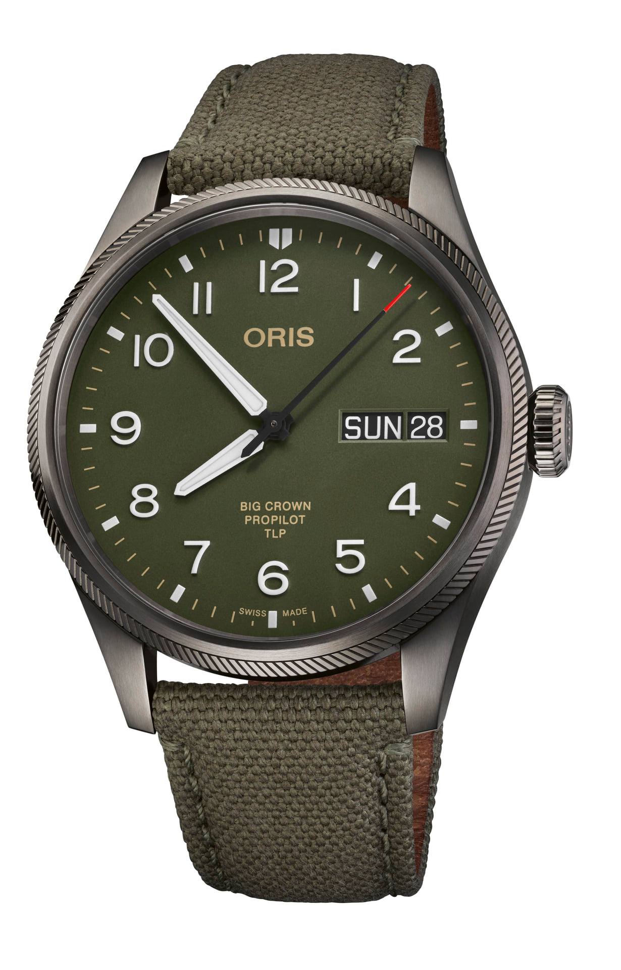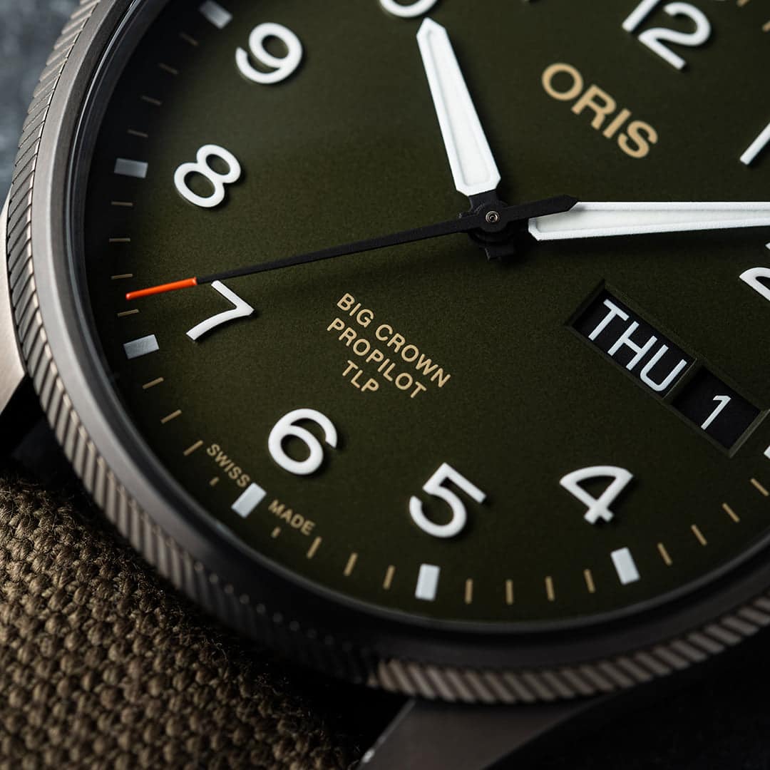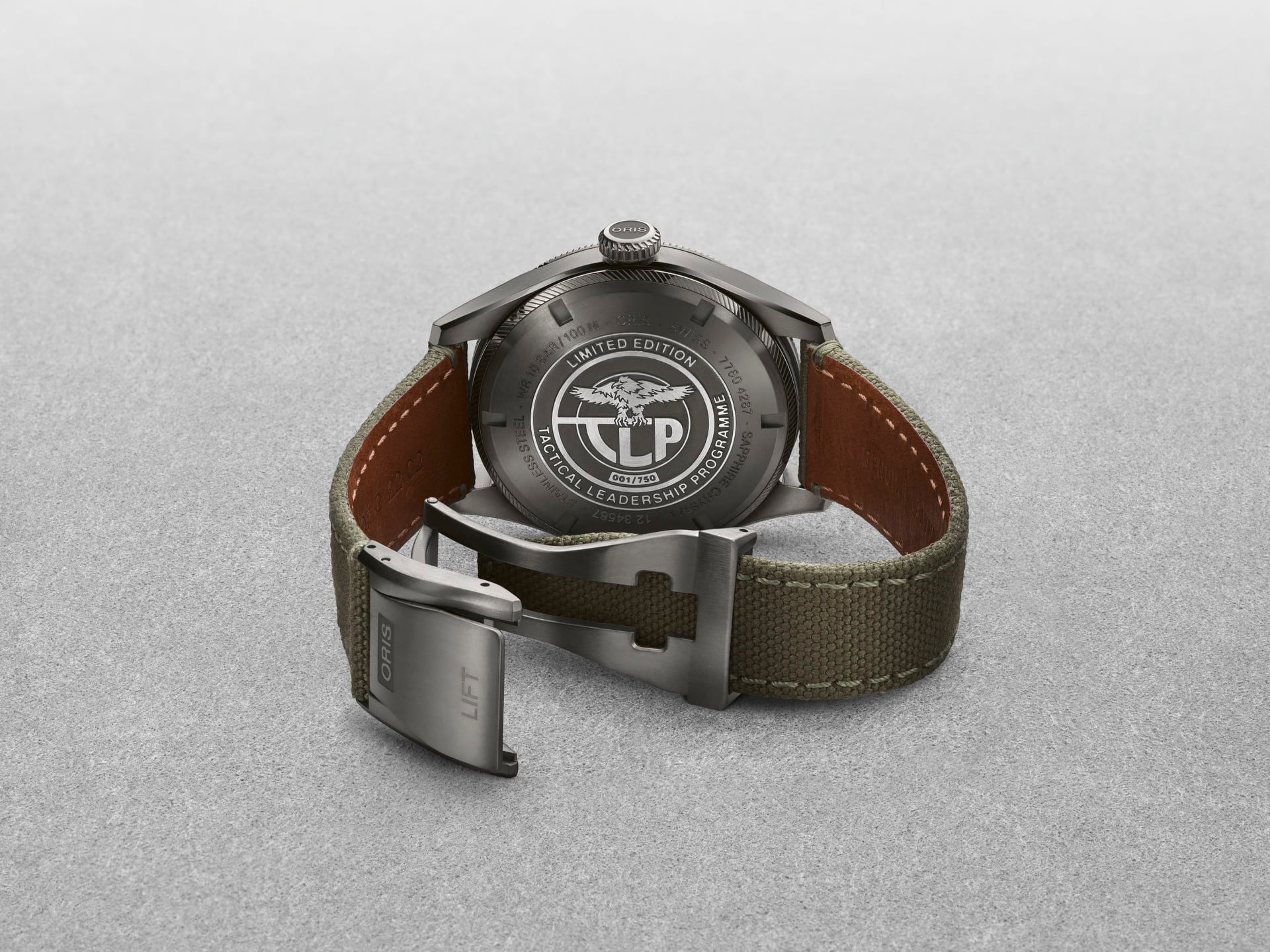 Para celebrar la nueva asociación, Oris presenta la Edición Limitada TLP a 750 ejemplares dentro de la línea ProPilot, fabricada en caja de acero inoxidable con recubrimiento PVD gris metalizado, y acompañado por una hermosa carátula verde militar inspirada en la indumentaria de los pilotos TLP.