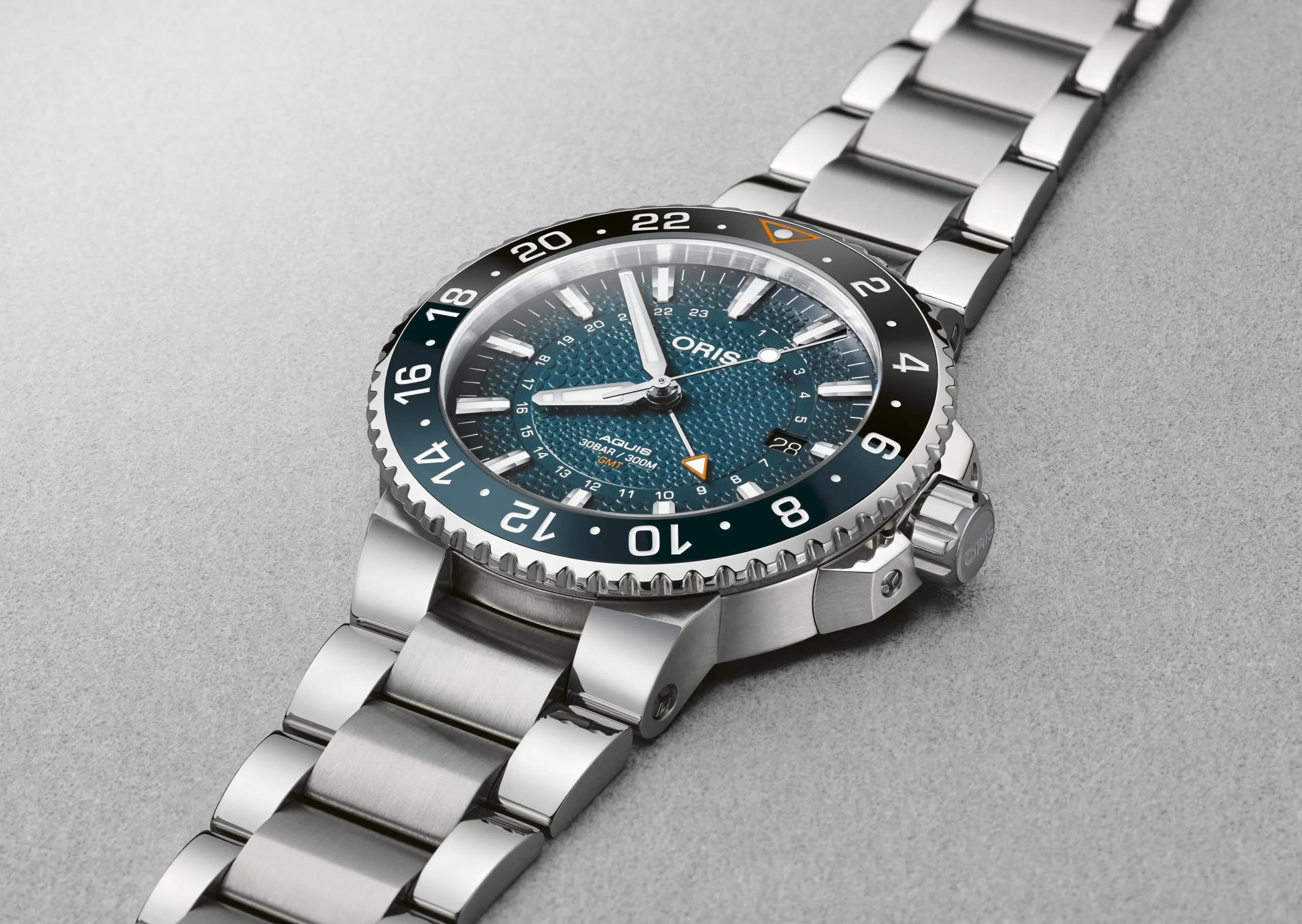 ¿Cómo es? Se trata de un Oris Aquis con segundo huso horario, un combo ideal para la práctica del submarinismo profesional en cualquier longitud-latitud del planeta. Está propulsado por el calibre Oris 798 que ofrece indicación de horas, minutos, segundos y fechador, adicional a la función de GMT. Su bisel está destacado en azul y negro para mostrar la indicación del día y la noche, además de poder coordinar un tercer huso horario. El mecanismo automático ofrece una reserva de marcha de 42 horas, y se alberga en una caja –de 43.50 mm– de acero inoxidable que garantiza una hermeticidad de 30 bar (300 m), por lo que está certificado como reloj de buceo.