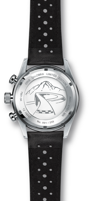 Edición a 250 relojes, en honor al Oris Rally Clásico realizado en la isla de Mallorca. La marca crea dos relojes para este año, que han sido inspirados en los tableros de los autos deportivos de los años 60 y 70 que participan en el Rally. Caja de acero de 44 milímetros de diámetro. Al interior de la cual late un movimiento de cronógrafo con remonte automático a ¼ de segundo. Números y manecillas con SuperLumiNova®. Correa especial en cuero horadado, y en su fondo, se encuentra grabada la famosa curva del Rally.