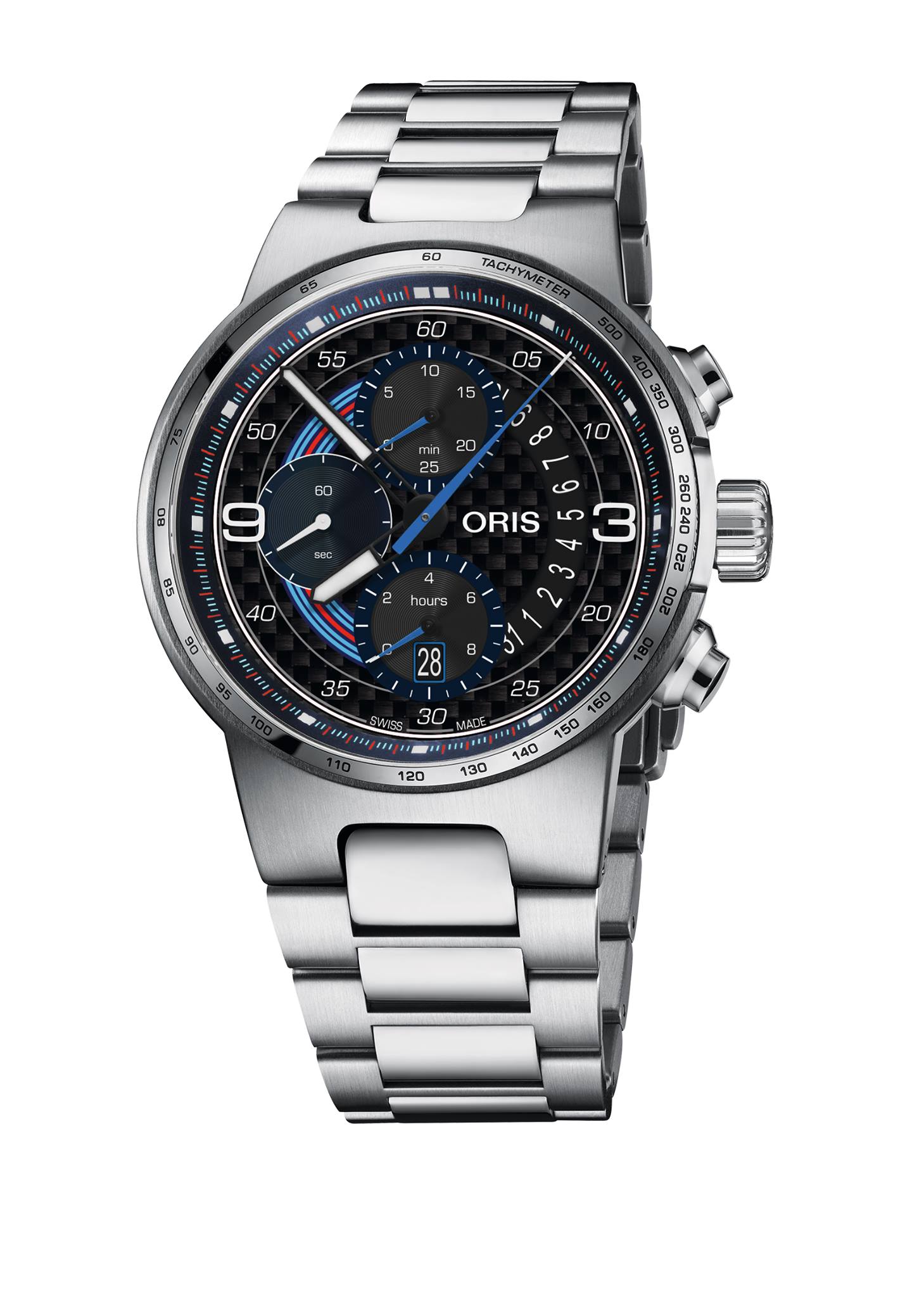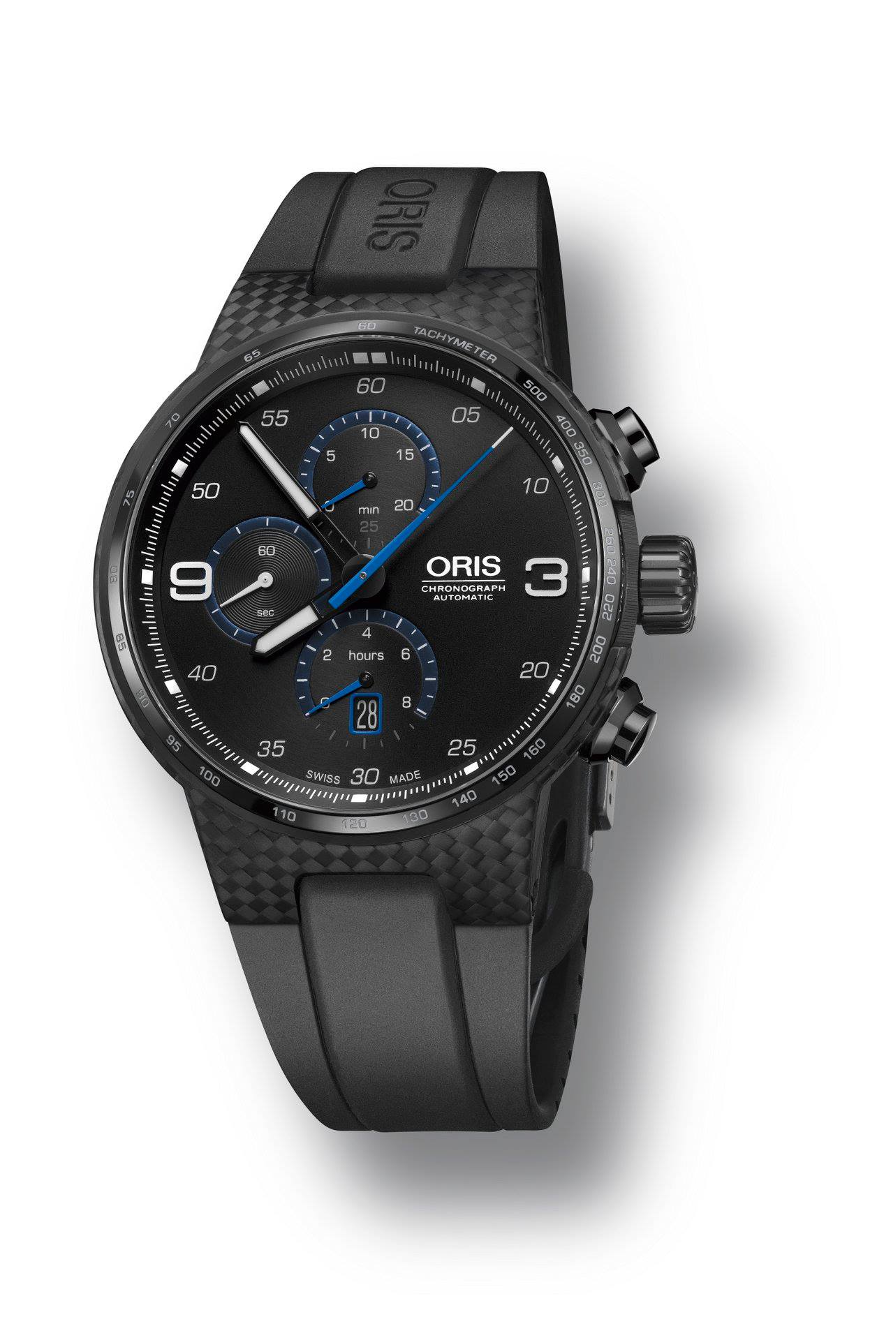Tomando algunos de los procesos de la Manufactura de la Escudería Williams, la marca desarrolló y patentó la caja del nuevo Oris Williams Chronograph Carbon Fibre Extreme hecha de fibra de carbono y titanio a fin de ofrecer una pieza totalmente exclusiva y con gran valor. El cristal de zafiro con tratamiento anti reflejos permite visualizar de una manera fácil las agujas de las horas y minutos negras con Super-Luminova® blanco, así como también el segundero de color azul y las agujas del cronógrafo.