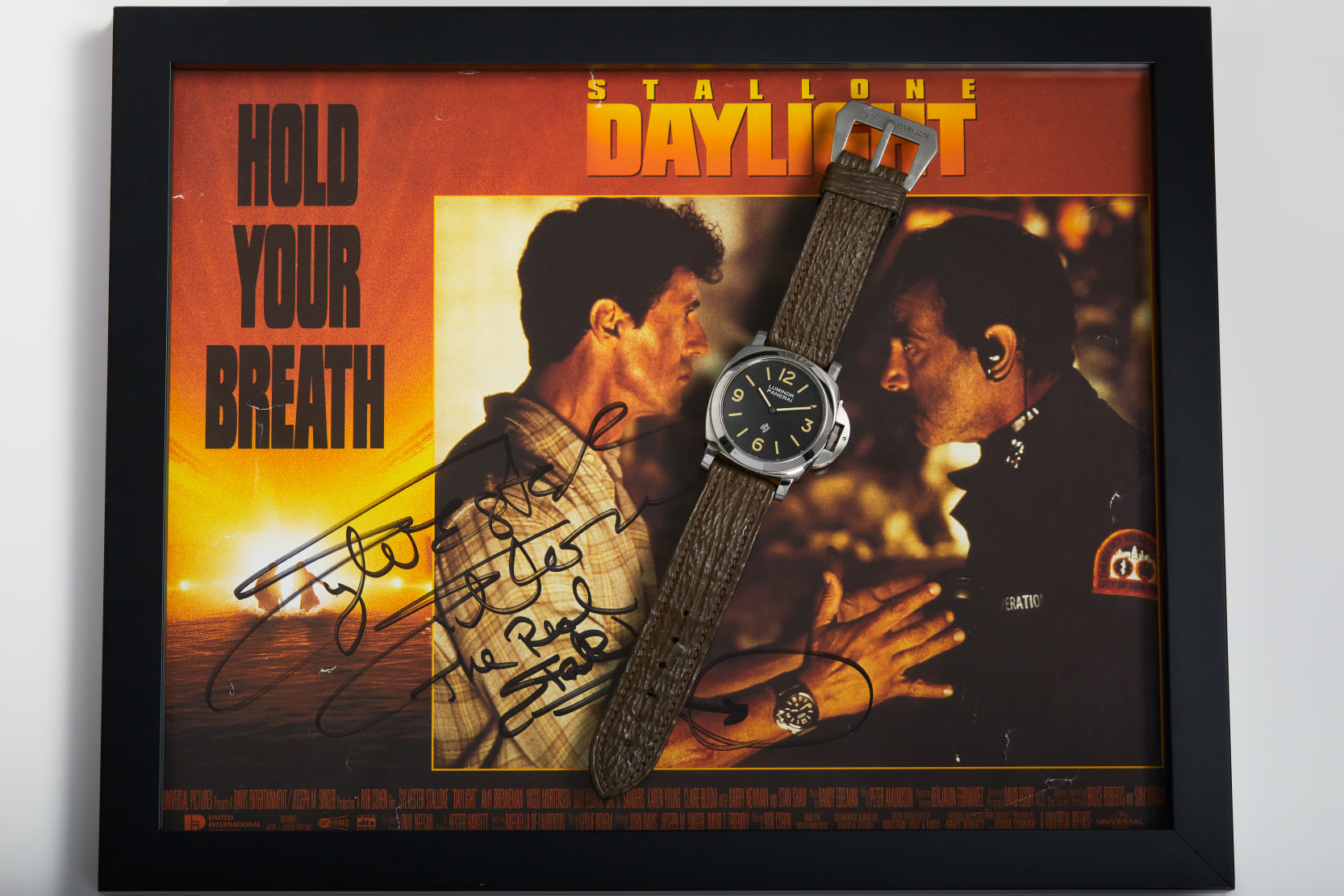 El actor declaró que el reloj, que había estado en su poder desde entonces, “pasó por un infierno en cada escena”. El lote de Panerai 5218-201/A incluía la caja original, dos correas Panerai adicionales con hebillas y su destornillador original. Además de una nota manuscrita firmada por el Sr. Stallone, una tarjeta de vestíbulo original emitida por el estudio de 1996 de la filmación Daylight, también firmada por el Sr. Stallone, con una referencia específica suya a este reloj