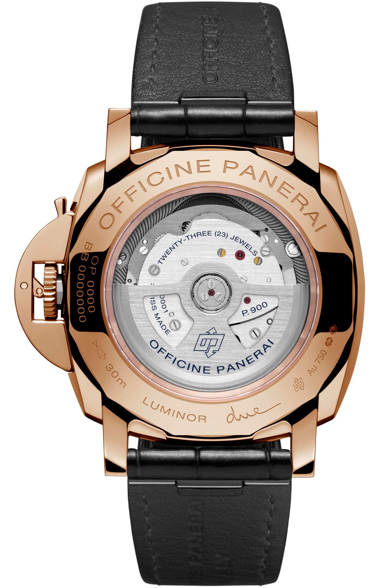 El nuevo calibre P.900 se adapta perfectamente al pequeño tamaño de la caja Luminor Due. Visible a través de la parte posterior de cristal de zafiro. Su perfil es de apenas 4.2 mm, por lo que es hoy uno de los movimientos automáticos más delgados de Panerai.
