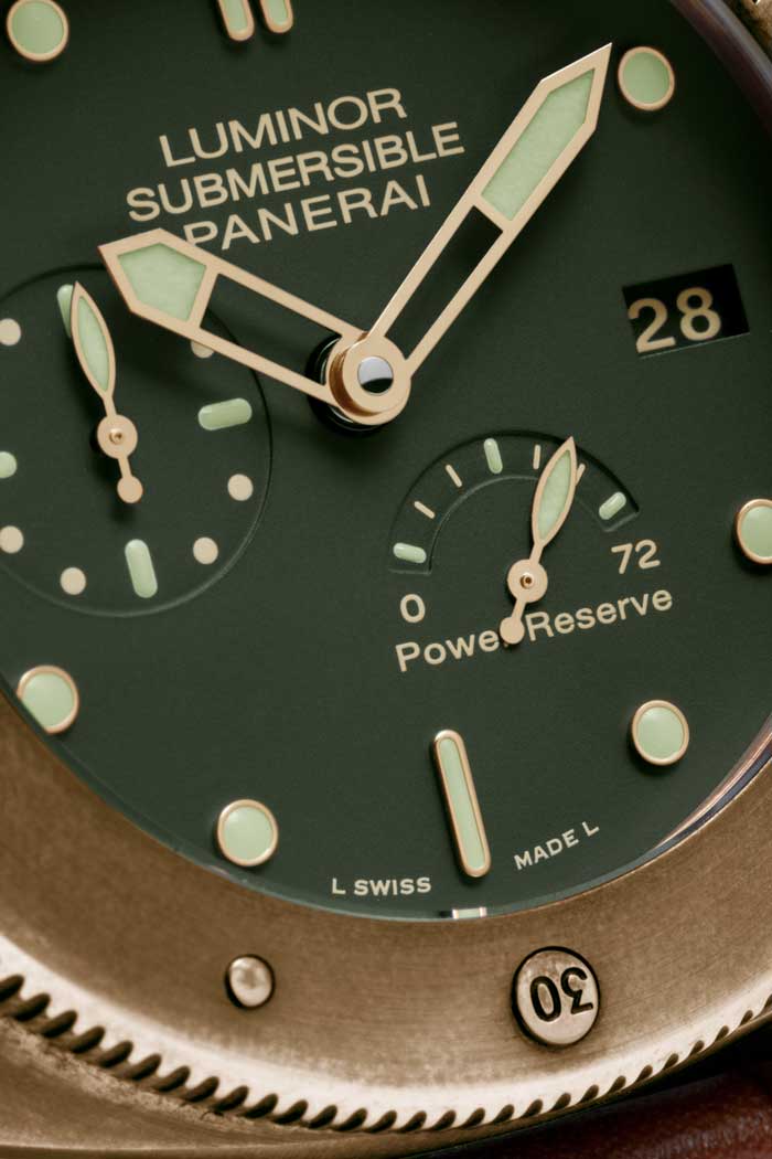- La visualización de la reserva de marcha de tres días en un indicador con forma de arco situado a las 4h. Esta función realmente útil se une a la presentación de la fecha, al dispositivo para poner a cero la aguja de los segundos, que tiene un valor incalculable al sincronizar el reloj con una señal de referencia temporal, y al sistema de ajuste rápido de la hora, que mueve la aguja horaria a saltos de una hora hacia adelante o hacia atrás sin afectar al funcionamiento del reloj. La carátula de color verde oscuro, con índices horarios aplicados, está rodeada por un bisel de bronce atornillado con una escala para medir la duración de la inmersión.