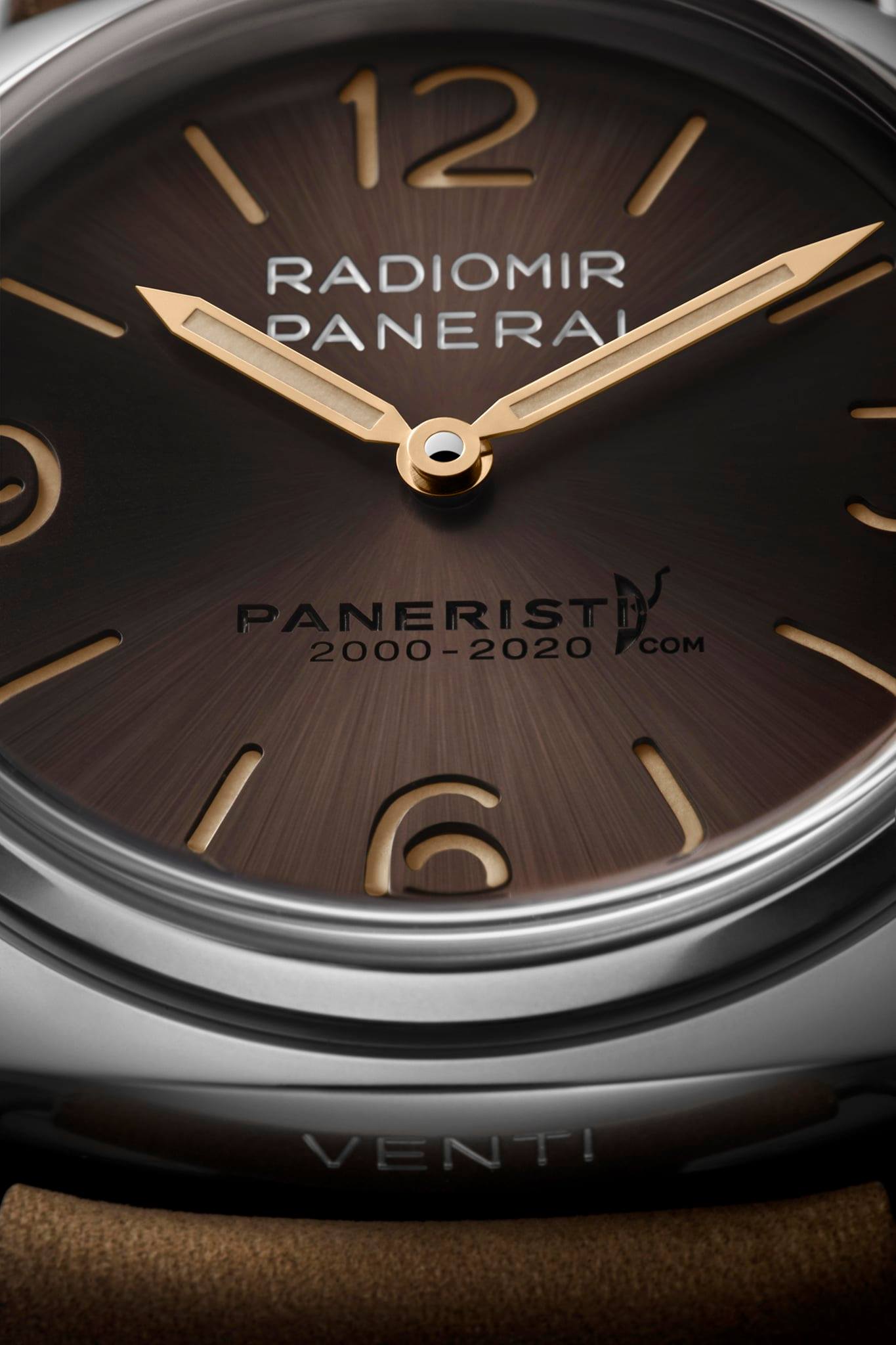 Radiomir 45 mm también destaca por el uso de manecillas de color dorado en forma de espada. Un elemento típico de los modelos originales. Además, la presencia de acero AISI 316L acabado con una pátina mate, casi desgastada en el bisel y la caja y el grabado “VENTI” entre las orejetas a las 6 en punto rinden un homenaje mayor a la comunidad de Paneristi.com.