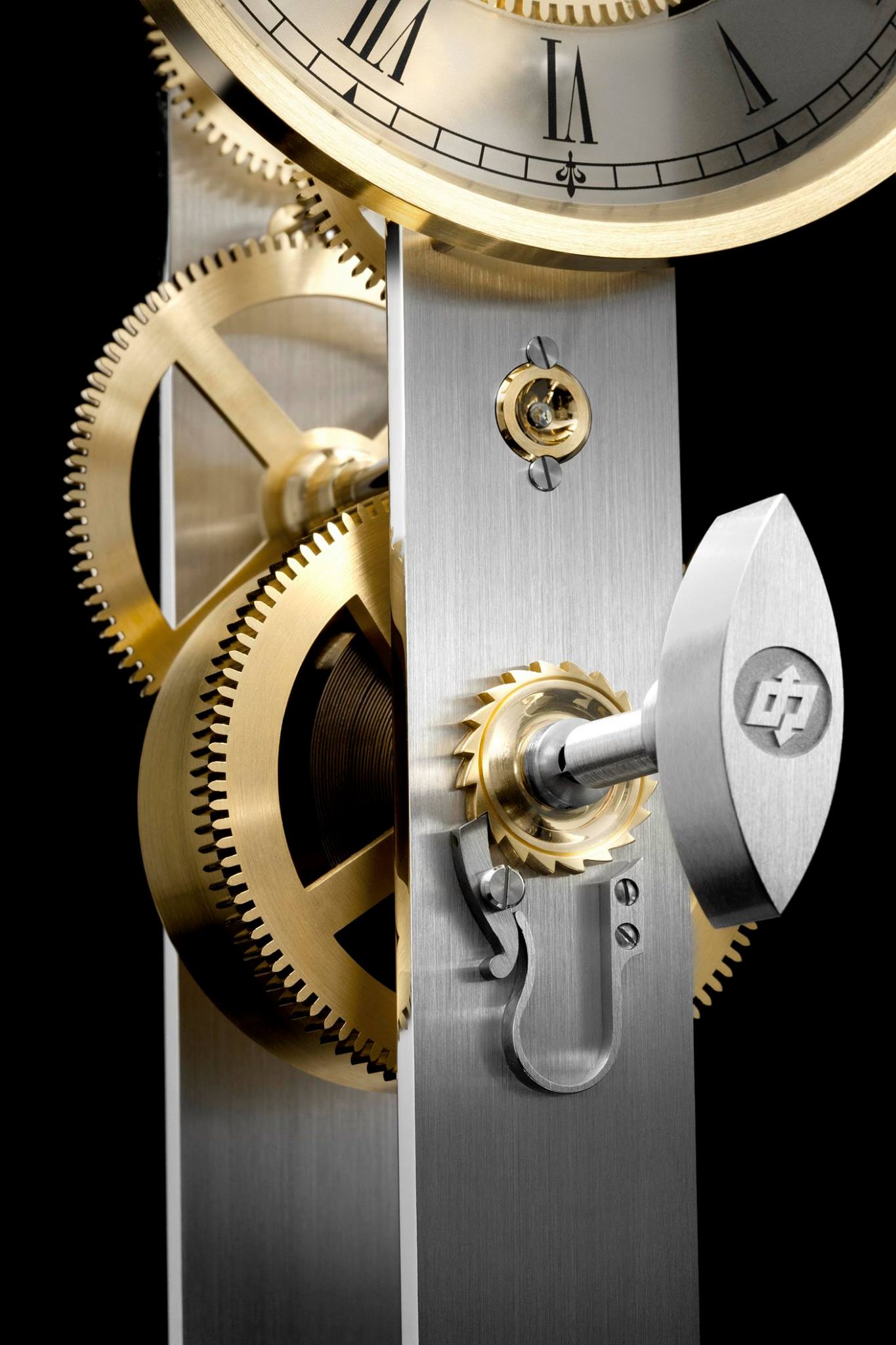 El travesaño superior sujeta el escape y la suspensión del péndulo, mientras que el inferior conecta las piezas inferiores de las placas de la estructura, que conforman cuatro pies curvados. Entre la base y la carátula se encuentra el barrilete con el muelle, cuyo tambor contiene una cuerda de 4,10 metros de longitud que mueve el reloj durante ocho días.