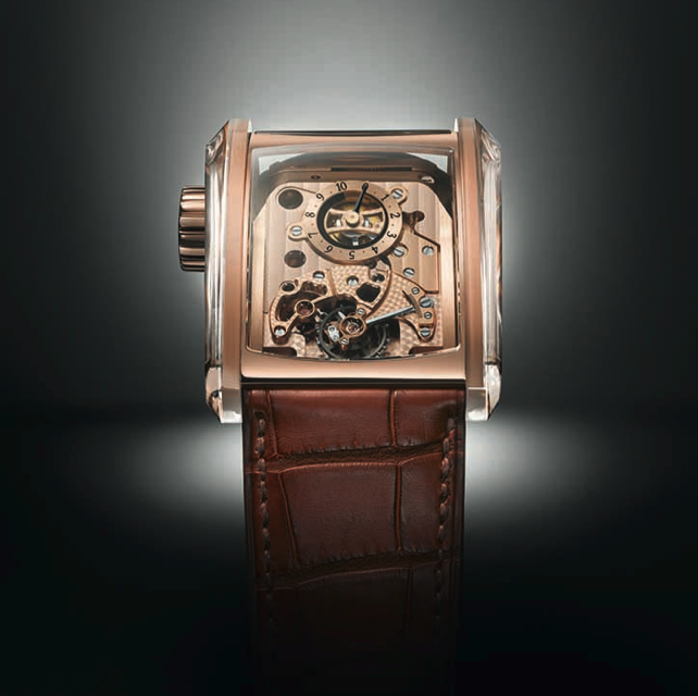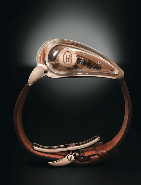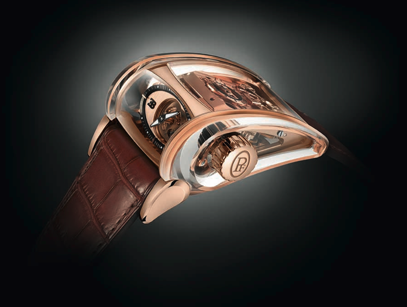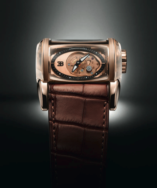 Cuando hablamos de este tipo de asociaciones hay que acelerar nuestros sentidos y presionar los pulsadores del cronógrafo de nuestra vida para comenzar a registrar el ritmo acelerado de nuestro corazón cuando admira las piezas de relojería dedicadas al mundo del motor. En esta ocasión, el calibre PF374 de remonte manual, diecinueve componentes del movimiento (entre puentes y platinas) se han realizado en oro rojo para aportar al Bugatti Super Sport Saphir esta dimensión de prestigio, que queda al descubierto gracias a un chasis hecho –en su mayoría– de cristal de zafiro.