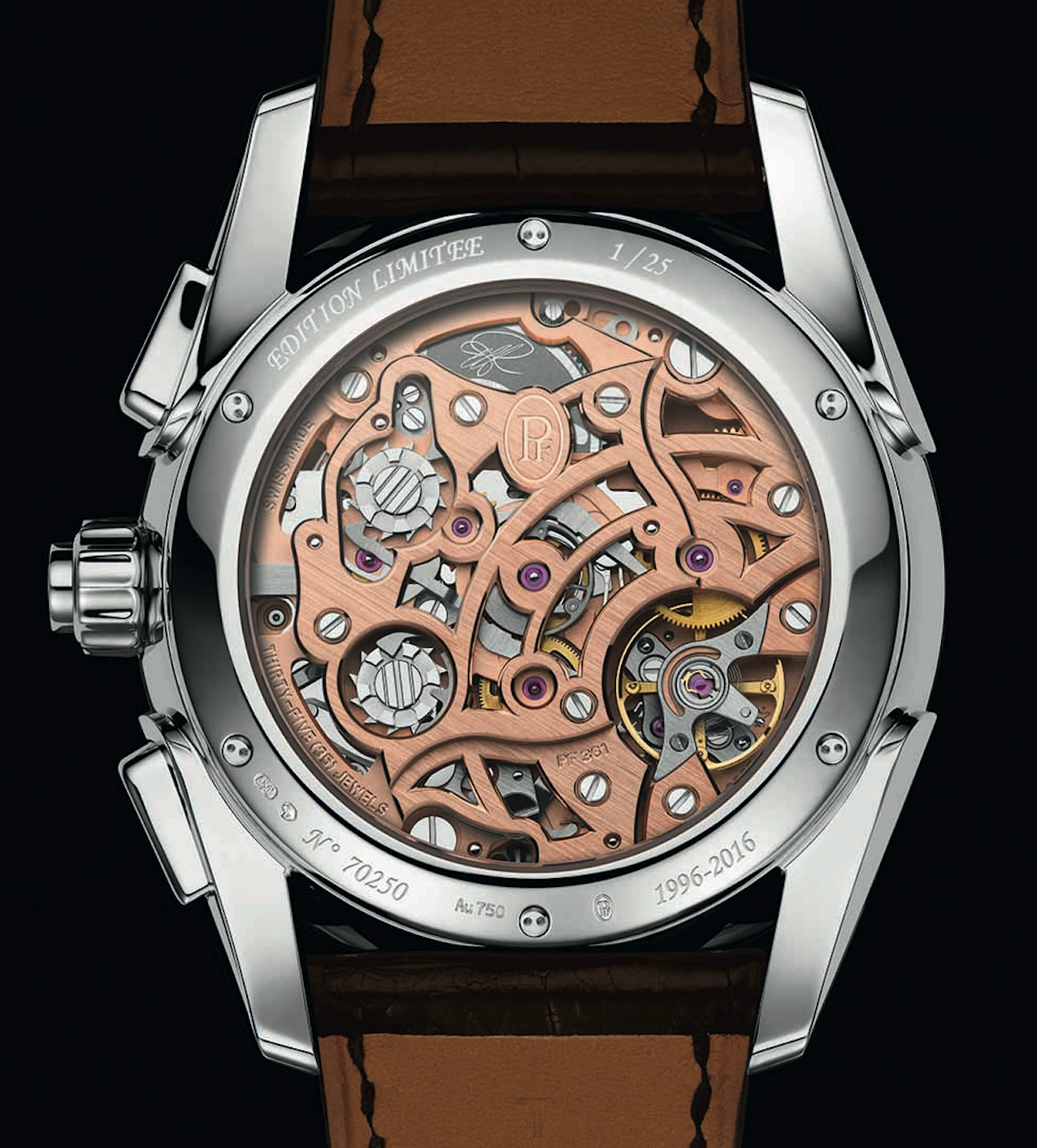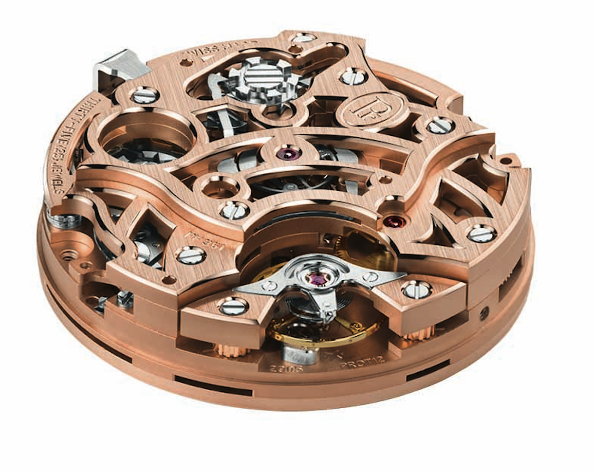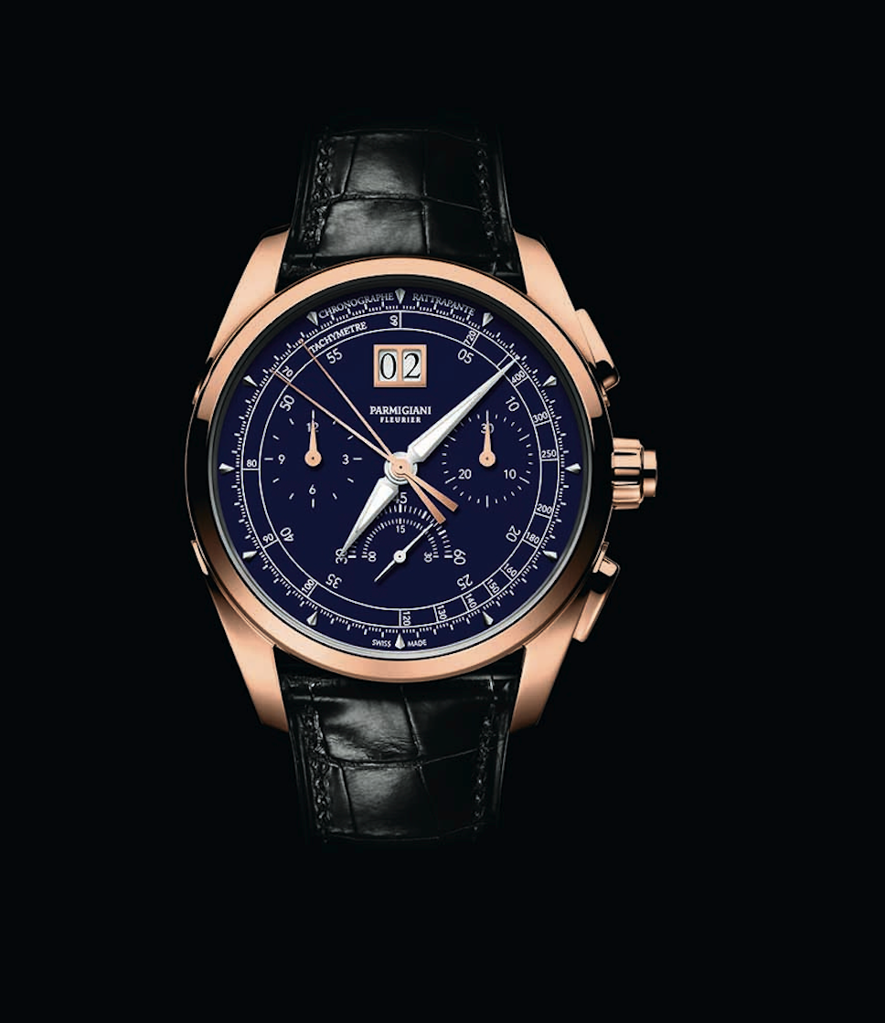 Nuevo movimiento de cronógrafo rattrapante –totalmente integrado– y con gran fechador: calibre manual hecho completamente en oro. Es el único cronógrafo integrado con split seconds a 5 Hz (36,000 a/h). Utiliza dos ruedas de pilares: una para el crono y otra para el el rattrapante. Los puentes presentan una decoración de Alta Relojería, carátula esmaltada (grand feu) azul u opalina, para la construcción de 25 piezas en caja de oro blanco y el mismo número construidas en oro rosa de 18 quilates. El movimiento, desarrollado en la Manufactura de Parmigiani Vaucher, lleva grabada la firma de Michel Parmigiani.