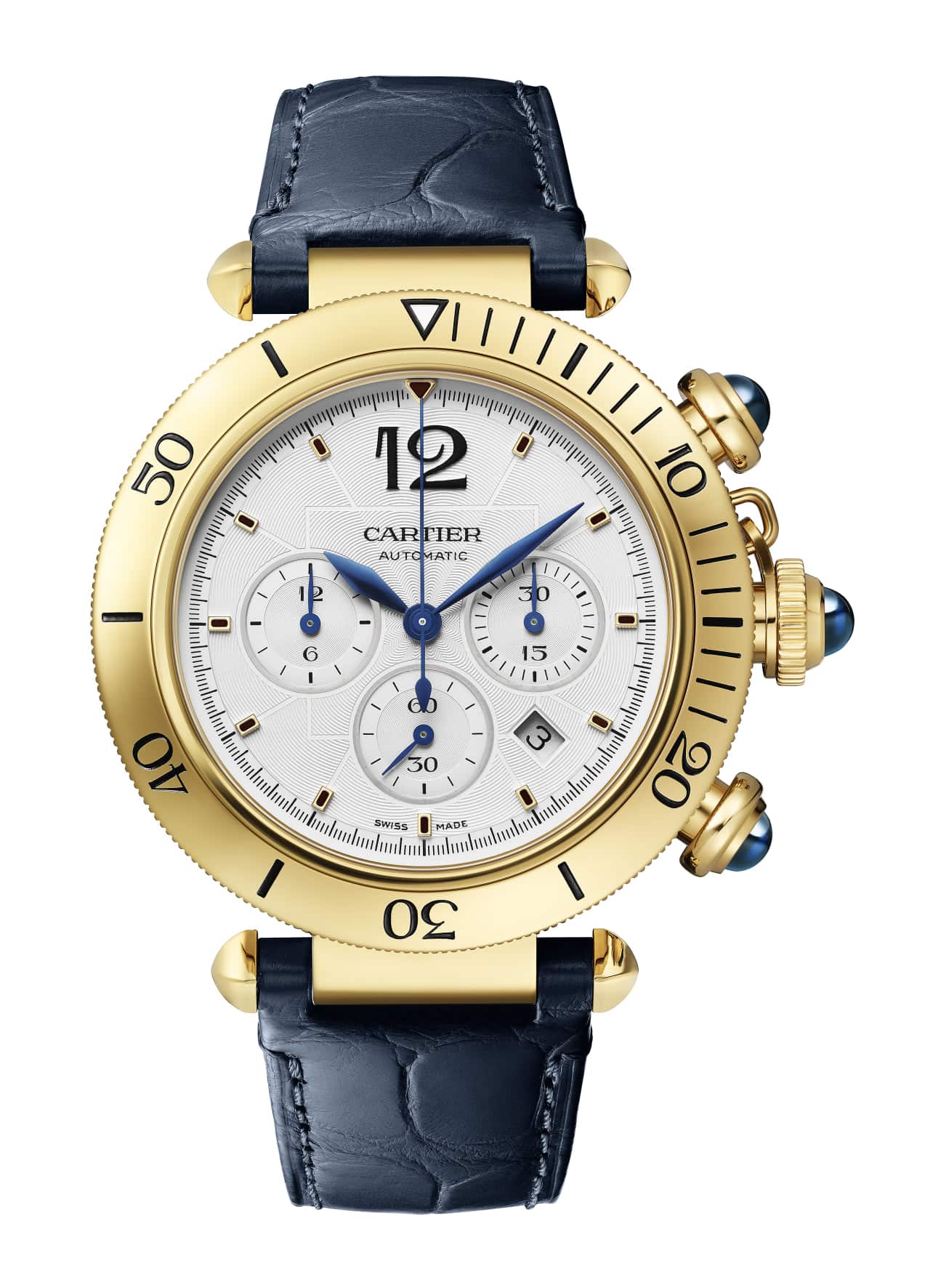 El nuevo cronógrafo Pasha de Cartier imparte una personalidad mucho más masculina, regresando con un bisel giratorio en una versión de acero de 41 mm o de oro amarillo de 18k. La escala tipo ferrocarril para los minutos se ha transferido a la periferia de la carátula, pero el reloj aún cuenta con la característica de corona y cadena con capuchón que revela una corona de zafiro cabujón y las barras de estilo Vendôme para las asas, diseñadas originalmente por Louis Cartier en 1934 con un punto piramidal.