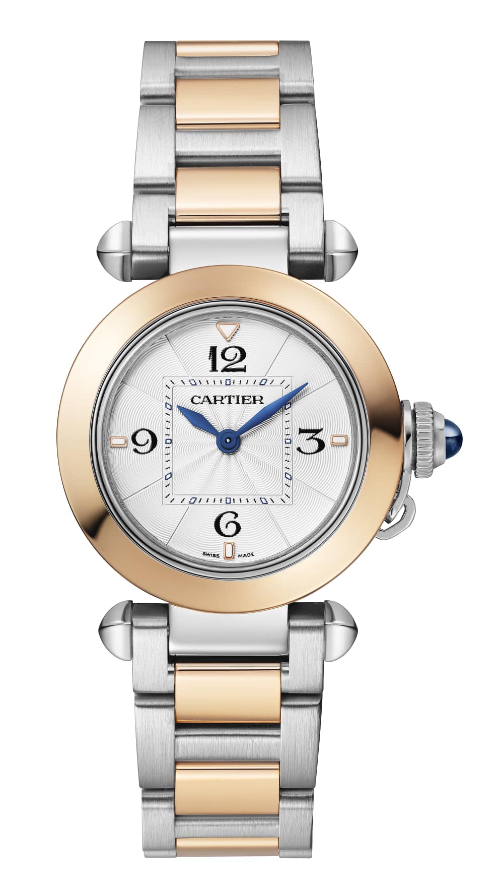 Acero, oro, con o sin diamantes, todas las versiones son intercambiables gracias a una adaptación del sistema QuickSwitch, desarrollado por Cartier, cuyo mecanismo invisible se funde en la arquitectura de la caja. Se sitúa bajo la caja y se acciona ejerciendo una simple presión.
