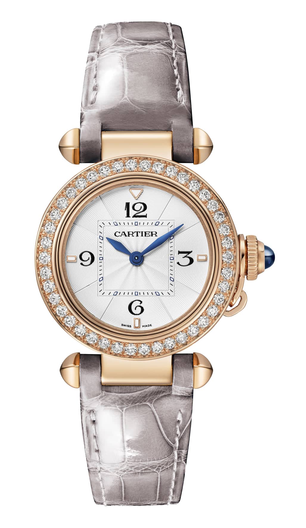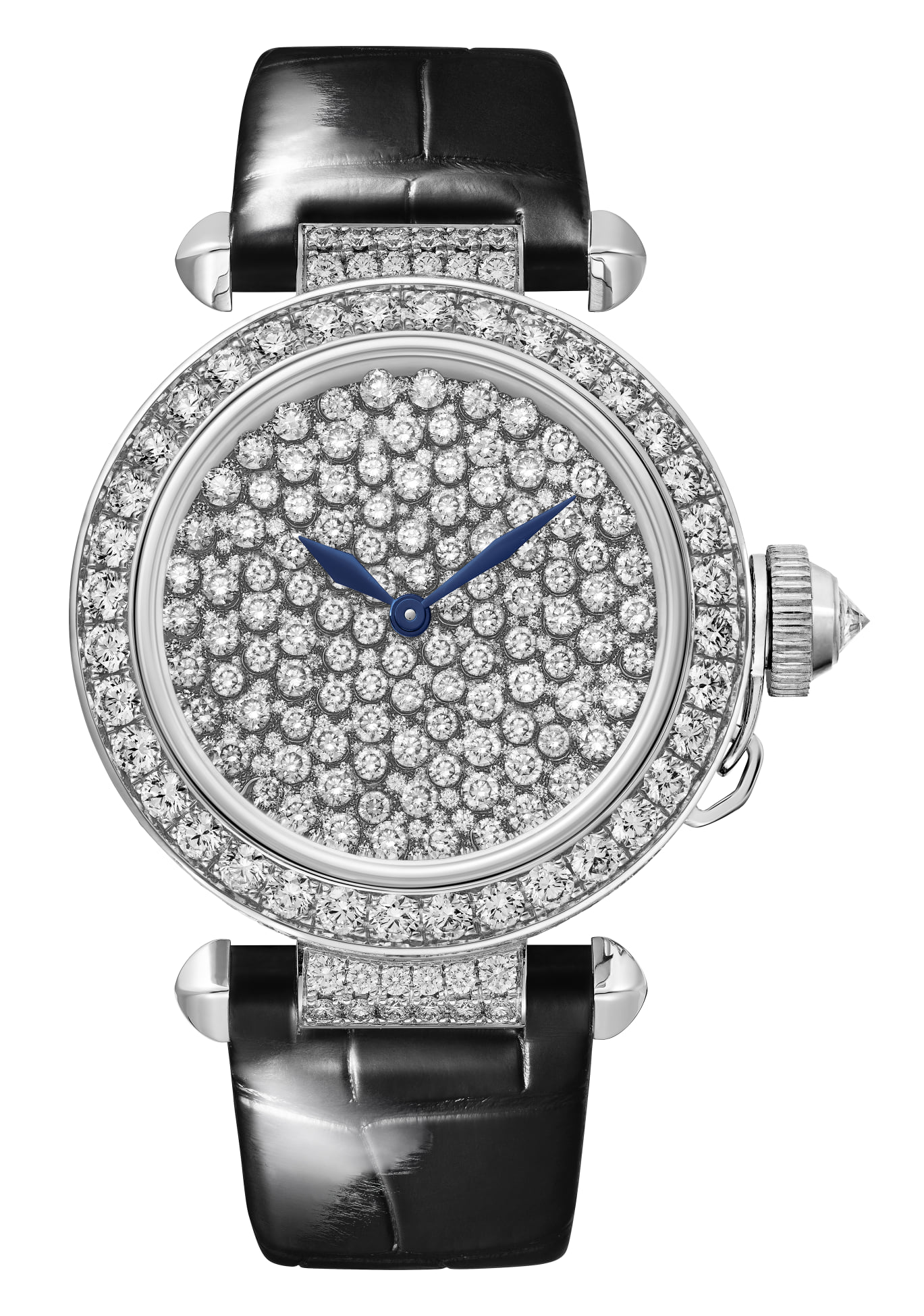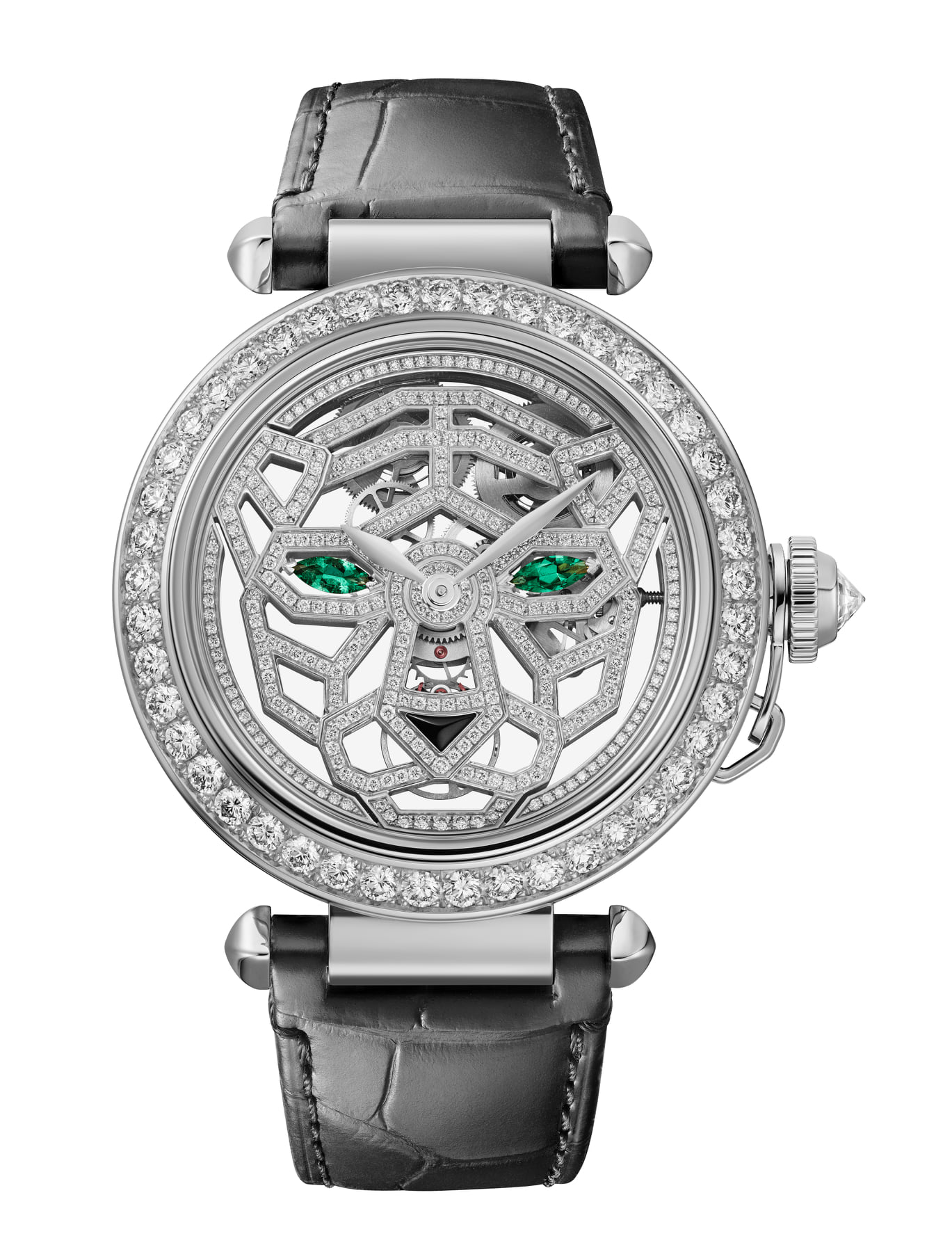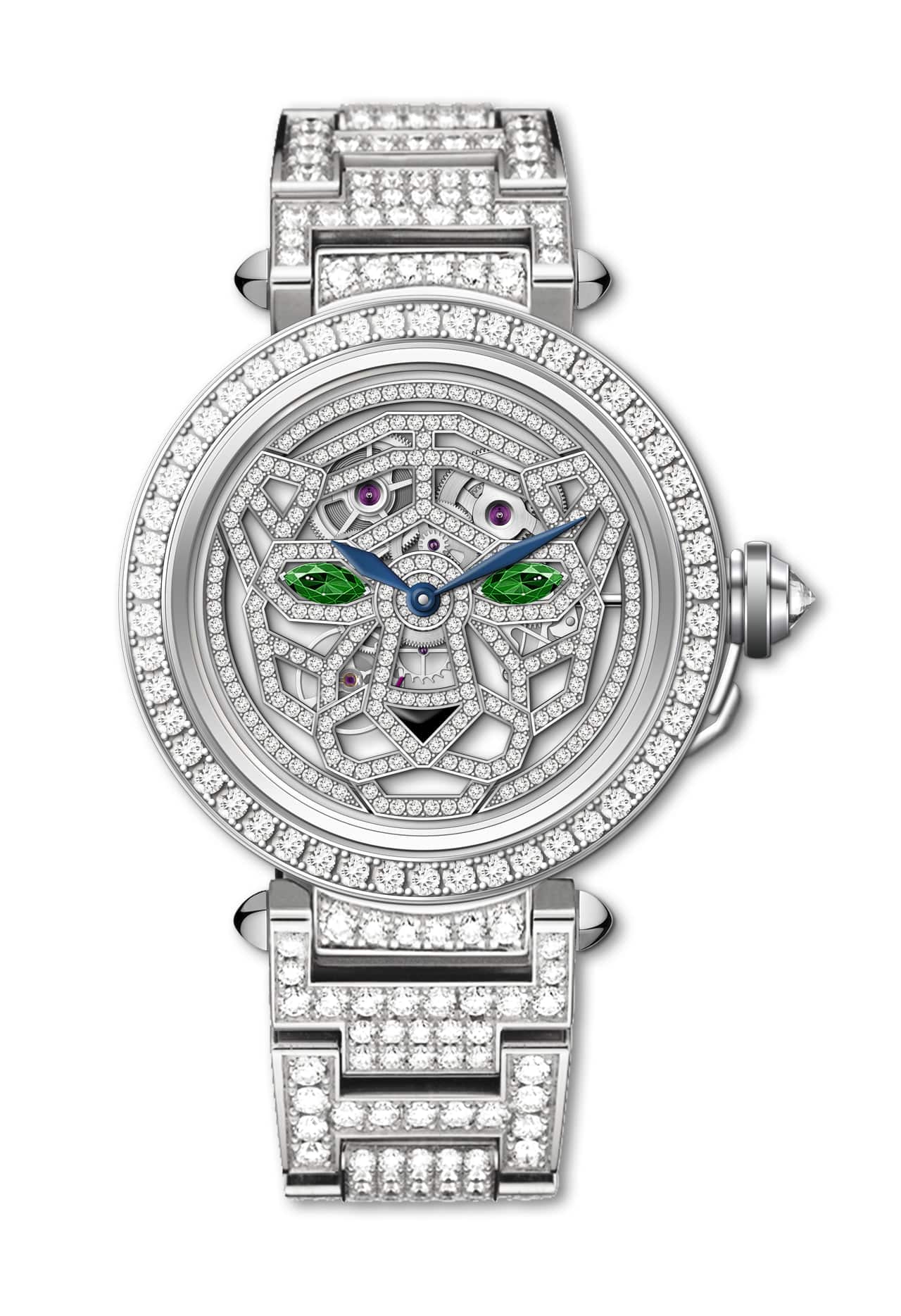 Finalmente, ediciones Pasha de Cartier esqueletados con patrón de carátula inspirado en la pantera, y una referencia con carátula pavé de diamantes talla brillante, se suman a la línea.