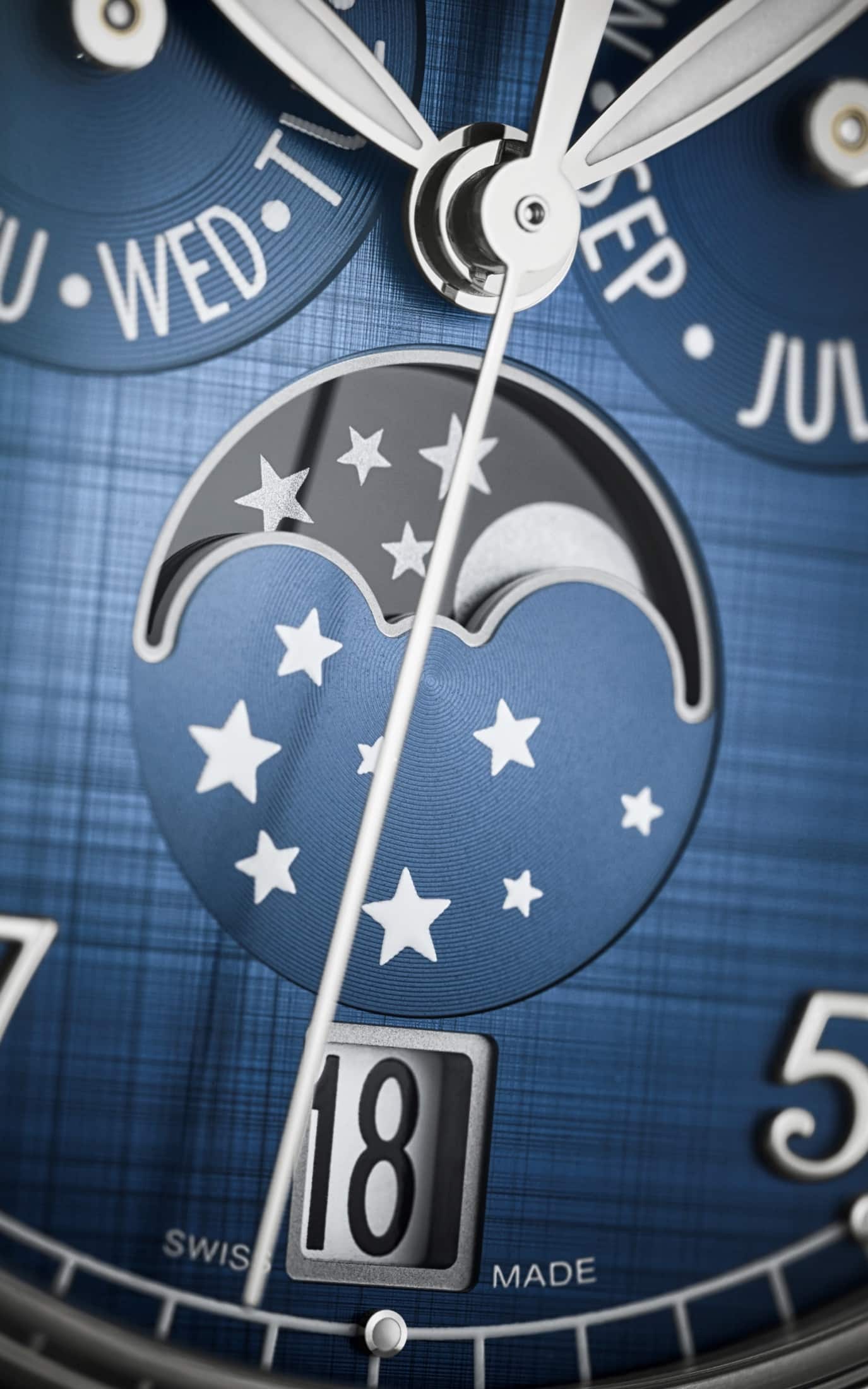 - Carátula: azul con acabado Shantung, índices arábigos aplicados en oro blanco con minutería en color blanco; indicación de fase de Luna, fechador a las 6 y agujas tipo hoja con tratamiento Super-LumiNova®