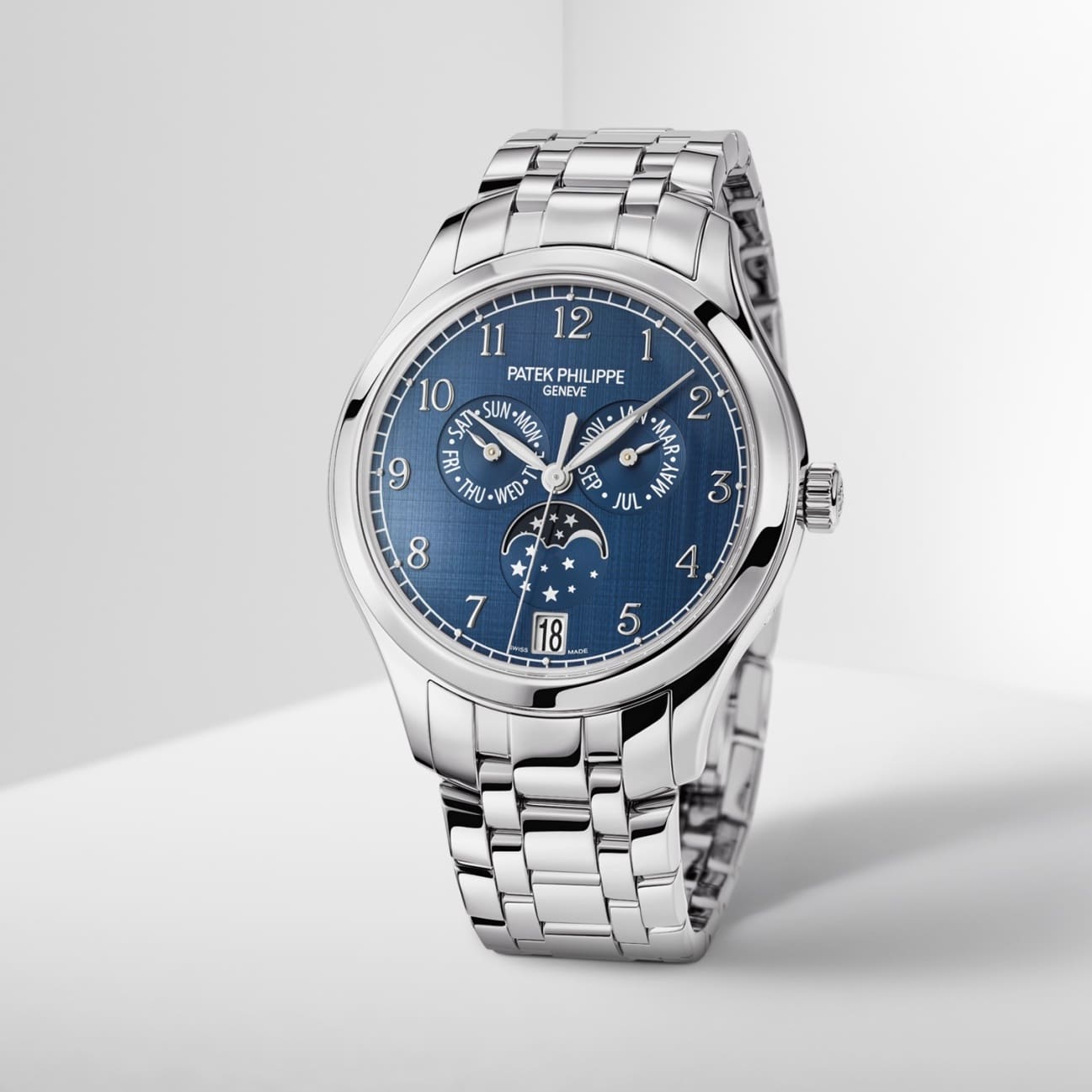 Por primera vez, Patek Philippe ofrece el Calendario Anual en una caja redonda de tipo Calatrava de acero pulido con un diámetro de 38 mm. Este reloj está equipado con un nuevo brazalete integrado con cinco filas de eslabones, totalmente pulido. Los reflejos del acero se combinan con una elegante carátula azul noche realzada por un doble acabado satinado vertical y horizontal. El Calendario Anual patentado de Patek Philippe requiere sólo una corrección al año.