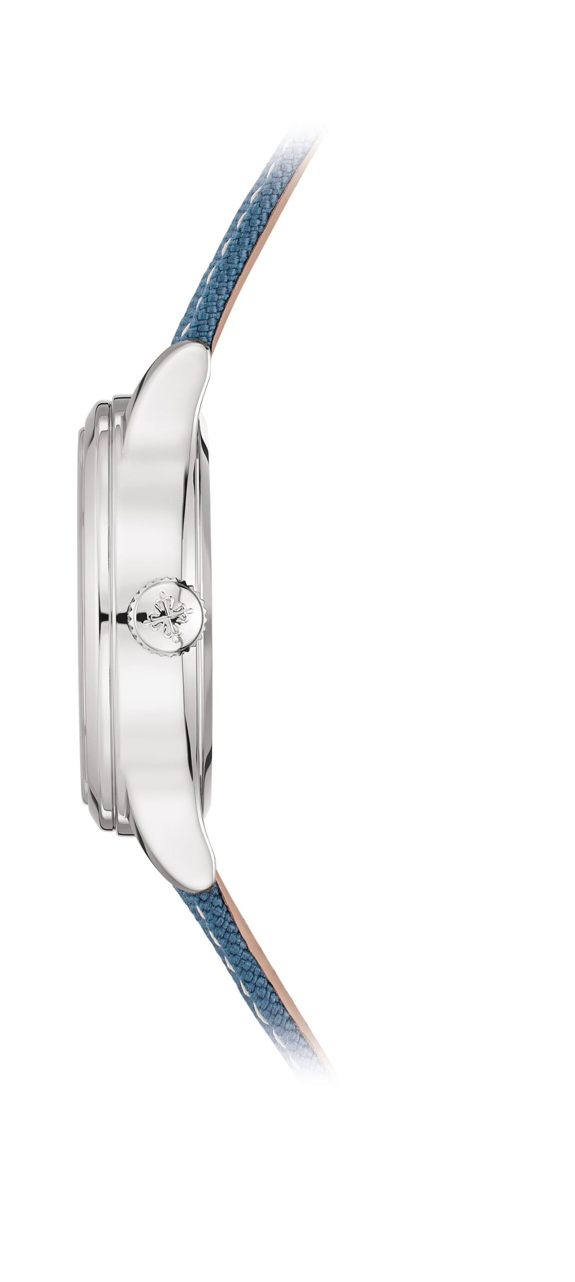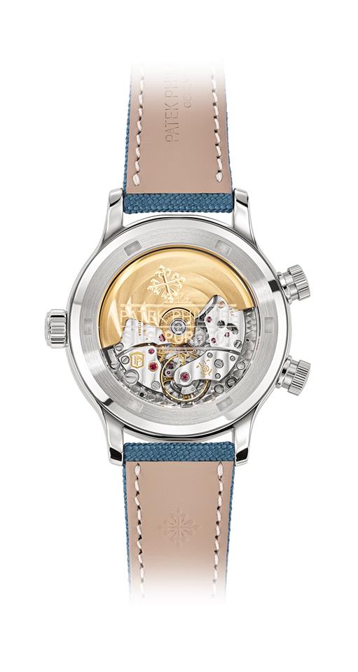 Si bien este Calatrava para señoras fue lanzado en Baselworld 2018, ha sido muy bien aceptado por el total del público. Al interior vibra el increíble calibre 324 S C FUS con funciones de hora, fechador, segundo huso horario e indicador día noche. Mientras que esta referencia se distingue por su carátula color azul.