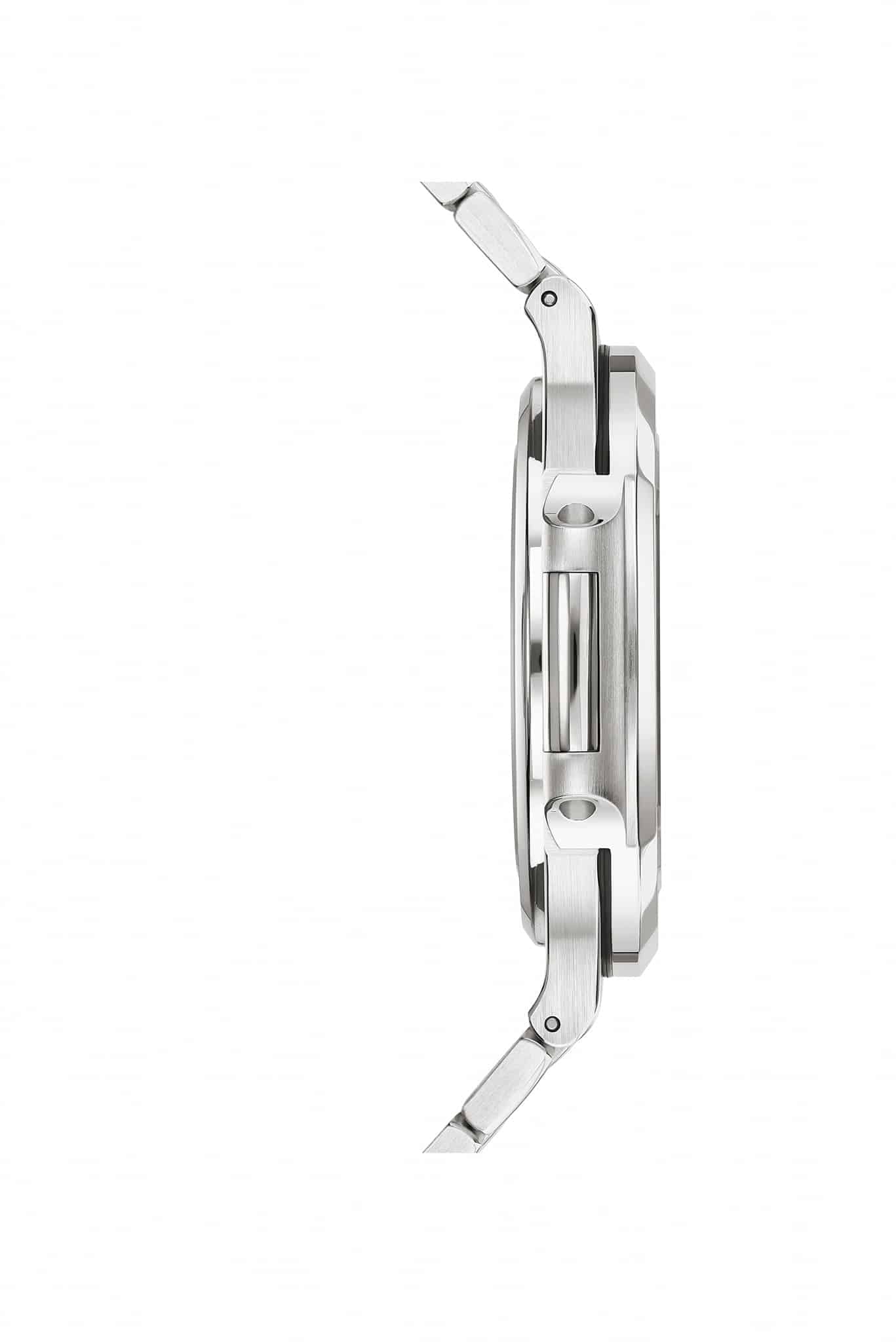 - Caja: 40 x 8.3 mm de acero inoxidable con acabados pulido y cepillado; cristales de zafiro en ambas caras; corona a rosca