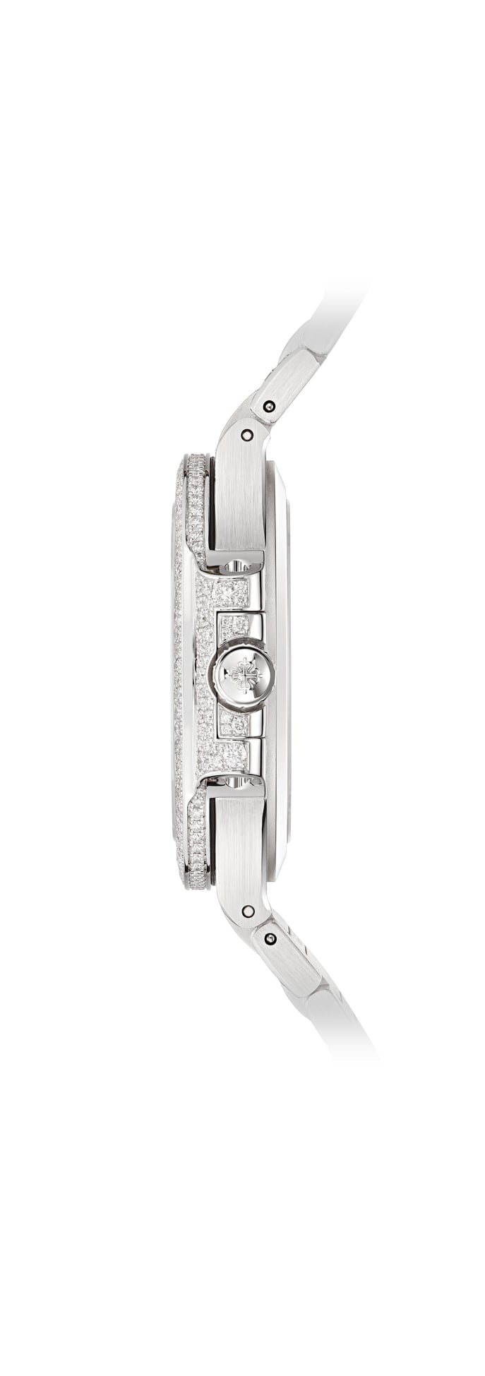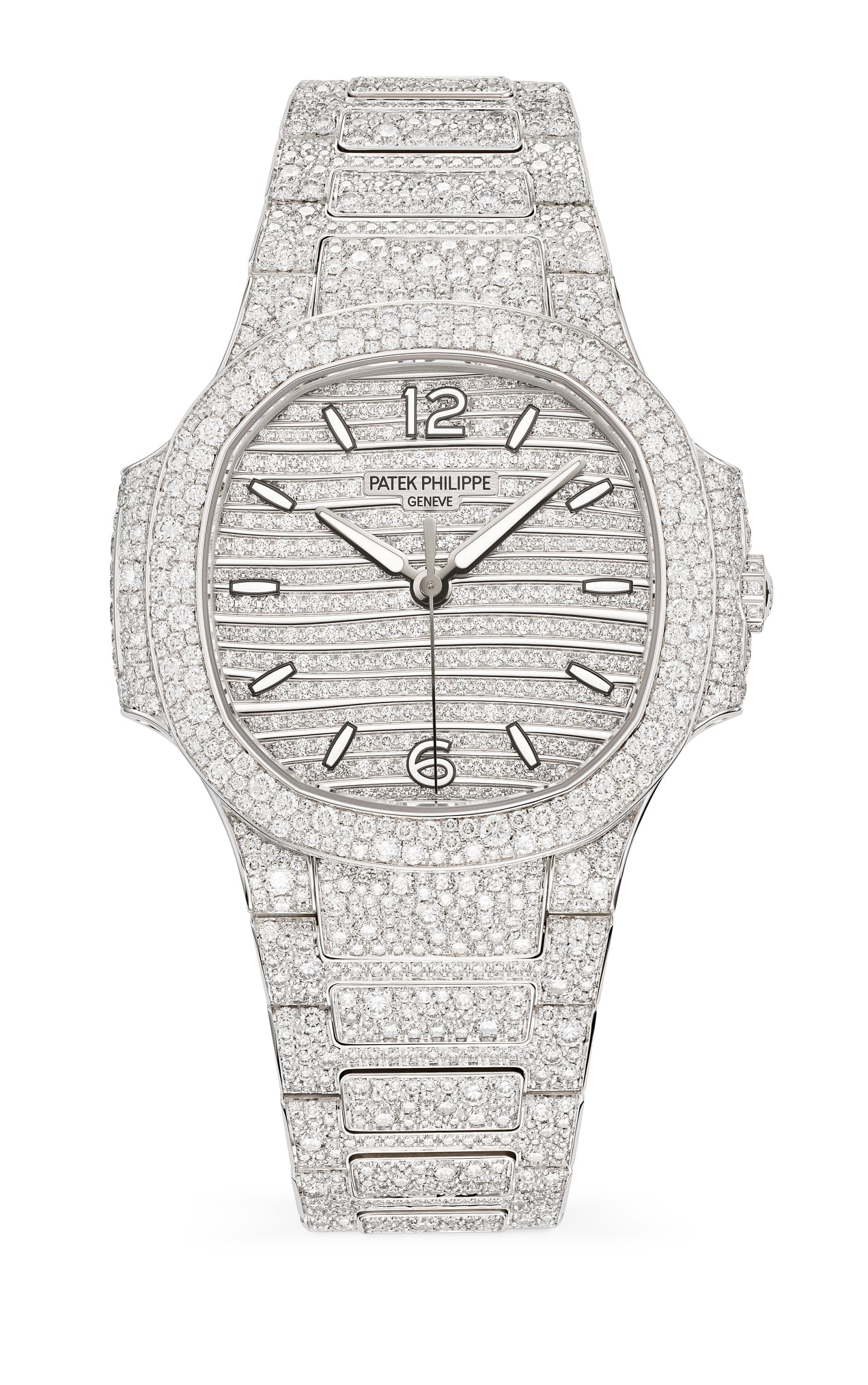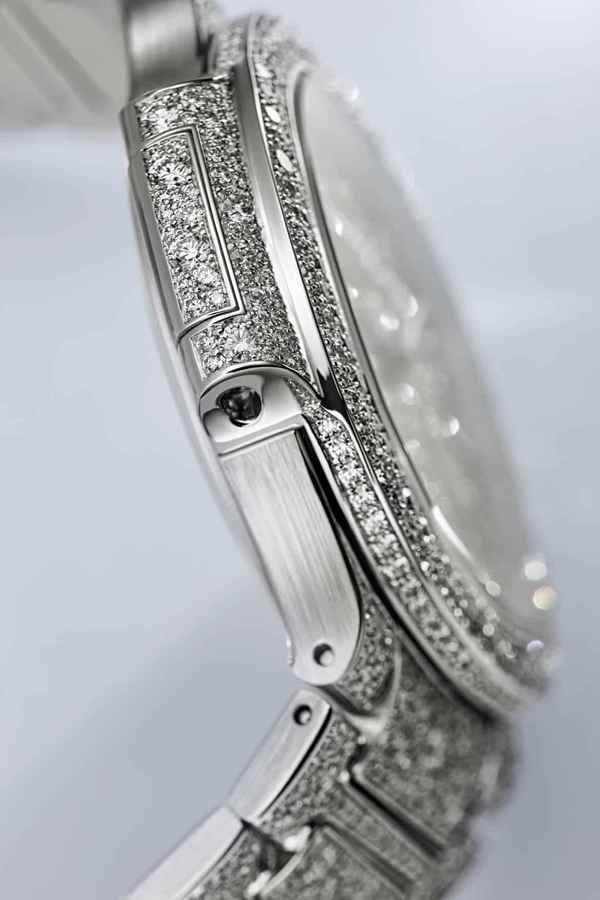 - Correa: brazalete de oro blanco de 18 quilates engastado con 1729 diamantes; cierre desplegable Nautilus engastado.