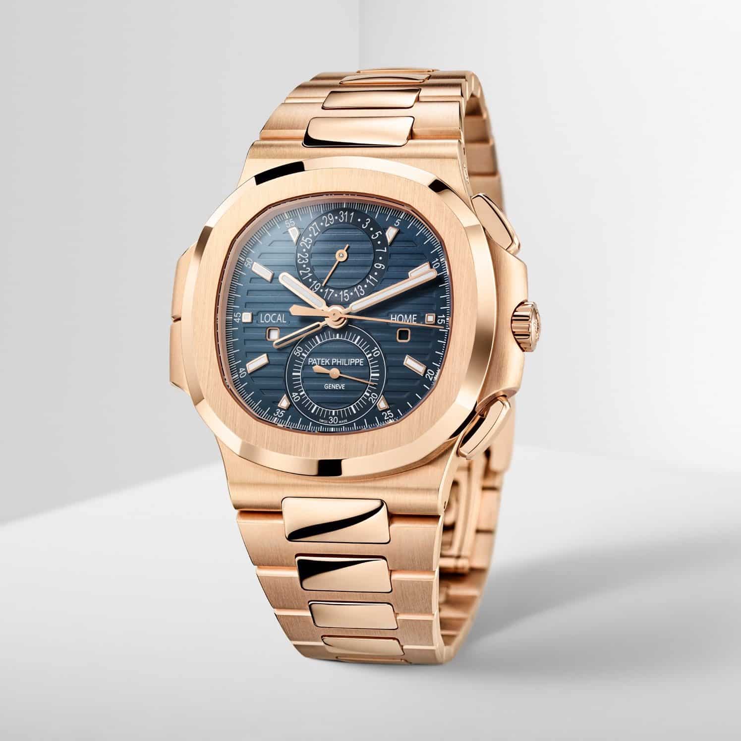 Presentado en 2014 para reemplazar al Nautilus Chronograph 5980/1A, el Nautilus Travel Time Chronograph 5990 combina tres complicaciones prácticas: un cronógrafo flyback, segundo huso horario y una indicación de fecha (junto con la hora local). El modelo se había lanzado en acero con una carátula gris en degradado, pero ahora la Referencia 5990 1R-001 en oro rosa se une ahora a la colección.