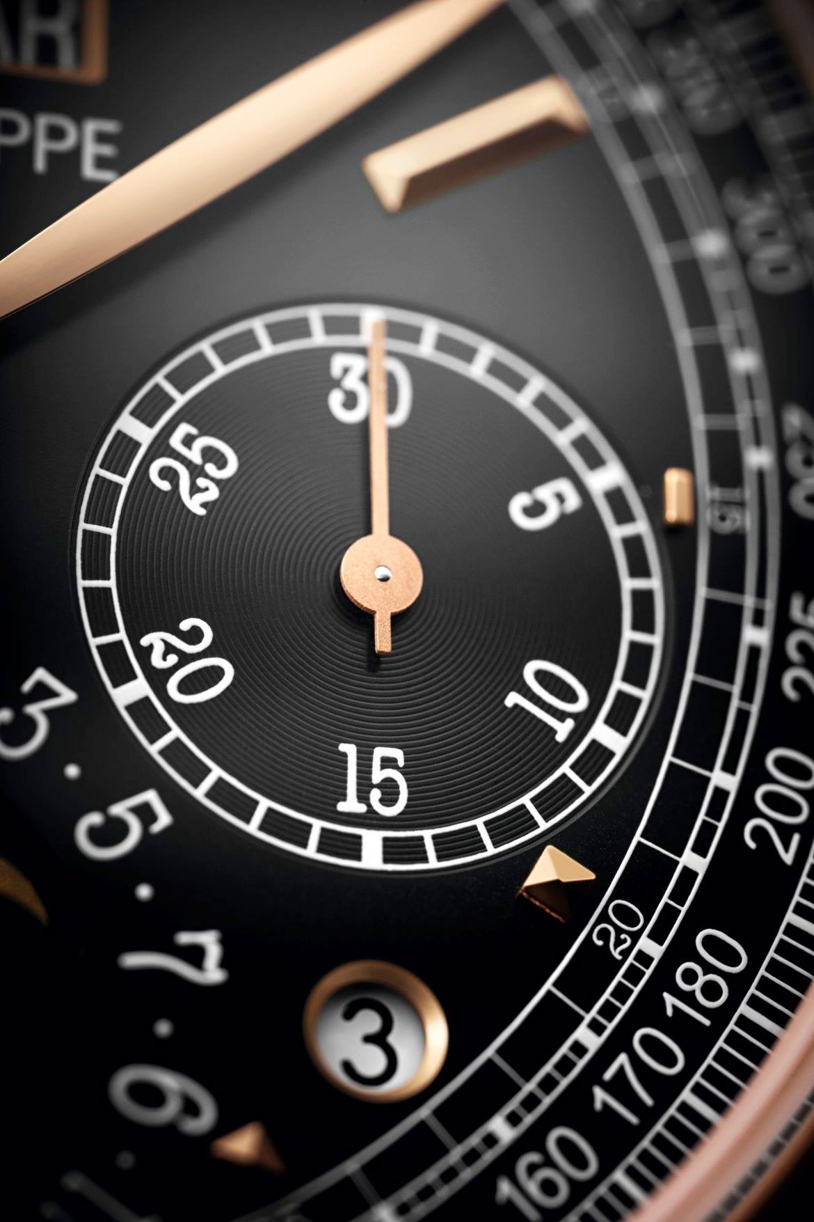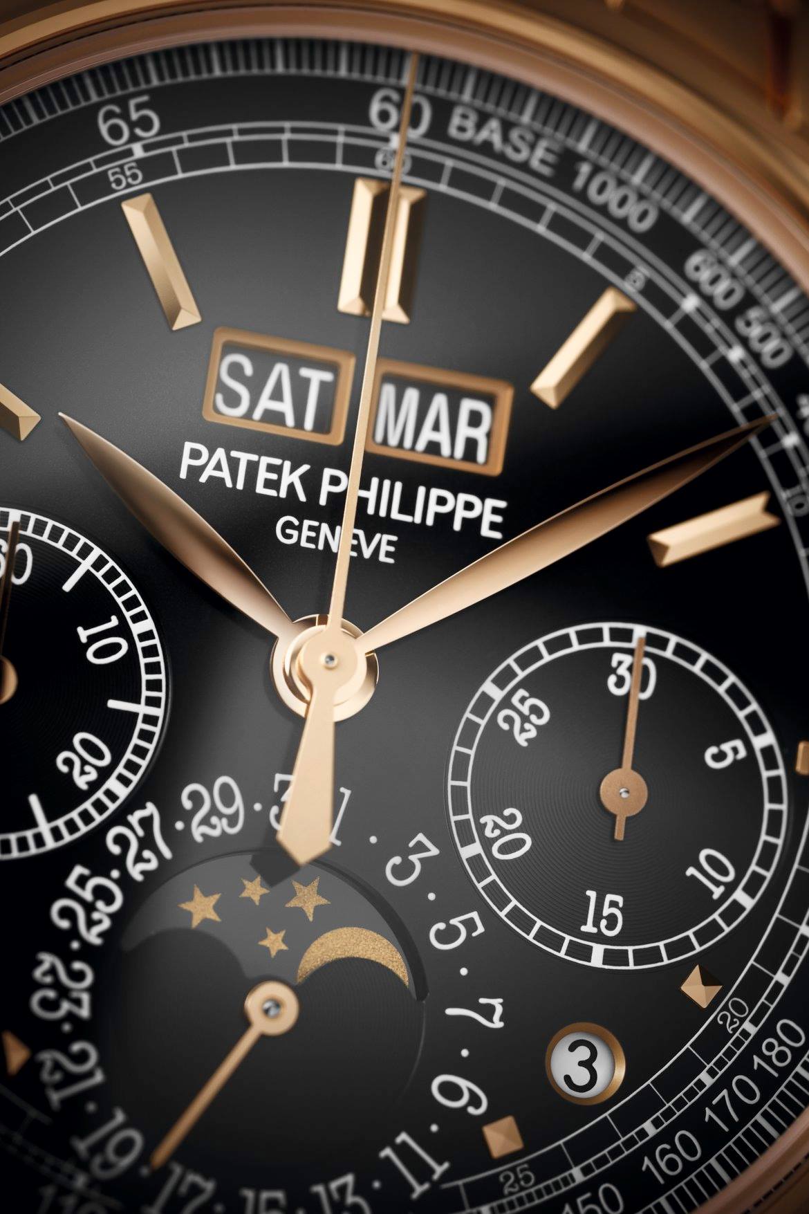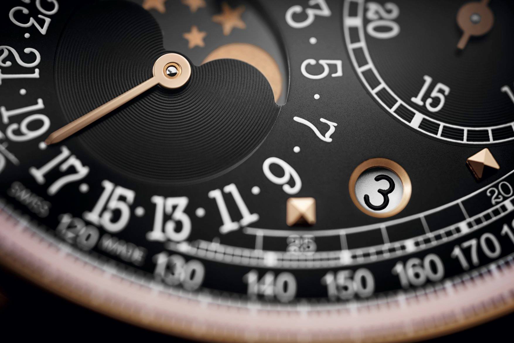 La carátula de color opalino plateado ha dejado su lugar a un dial en ébano negro con acabado rayos de sol sobre la que resaltan las agujas horas/minutos de tipo hoja, así como para los índices aplicados de oro rosa. Las visualizaciones del calendario perpetuo presentan un rostro legible y muy equilibrado con la indicación de la fecha por aguja a las 6 horas y una doble ventanilla día/mes a las 12 horas, completadas por dos pequeñas ventanillas redondas para la indicación día/noche y el ciclo de los años bisiestos, así como por una ventanilla para las fases de la luna. Las indicaciones del cronógrafo se distinguen por sus agujas arenadas. La escala taquimétrica permite medir las velocidades conjuntamente con el cronógrafo.