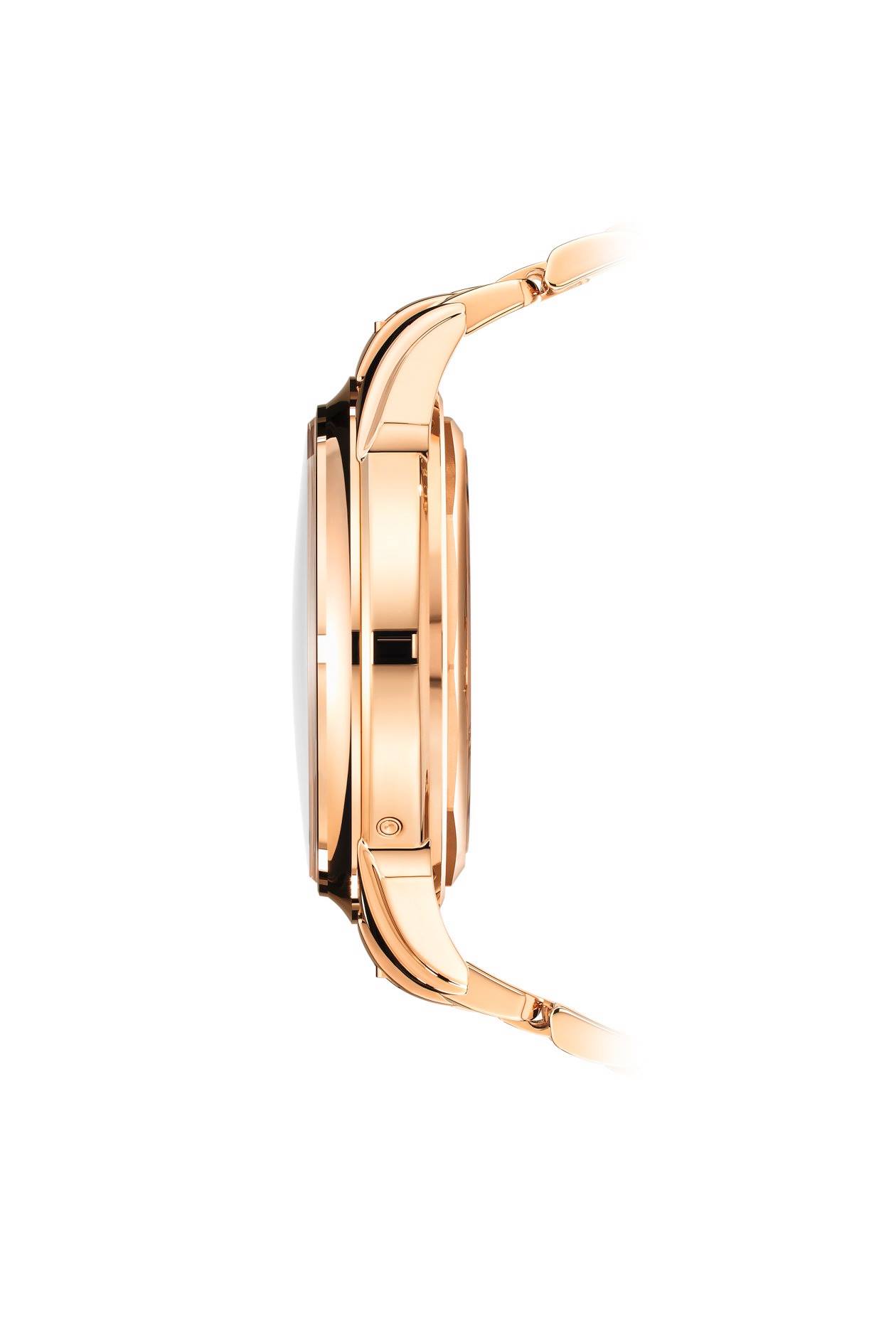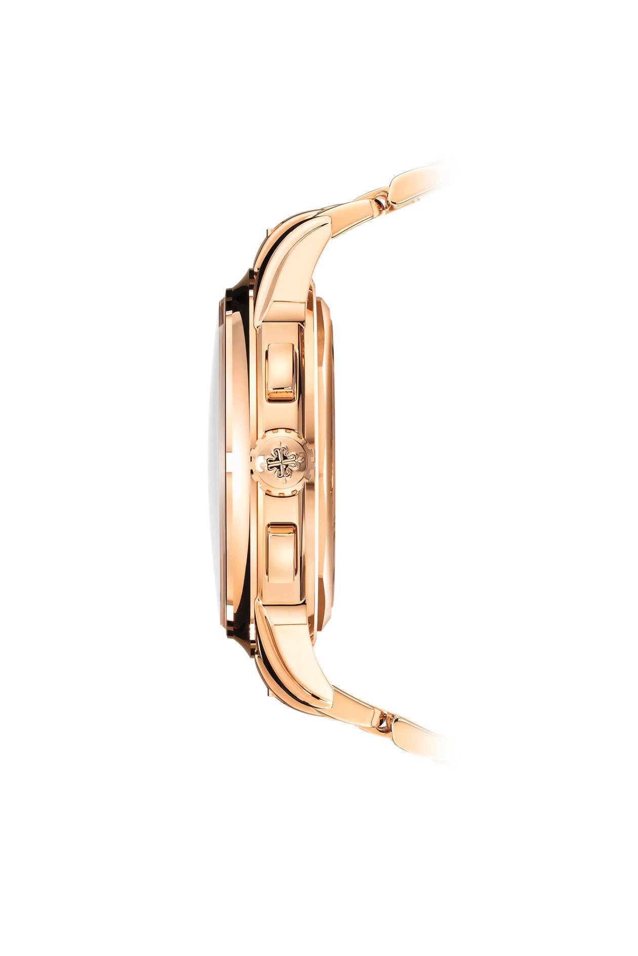 Propuesto desde 2015 con una pulsera de piel de cocodrilo color marrón, el cronógrafo con calendario perpetuo para hombre referencia 5270 de oro rosa se presenta ahora con el brazalete de oro estilo “Gota” totalmente integrado con la caja, un diseño refinado exclusivo de Patek Philippe.