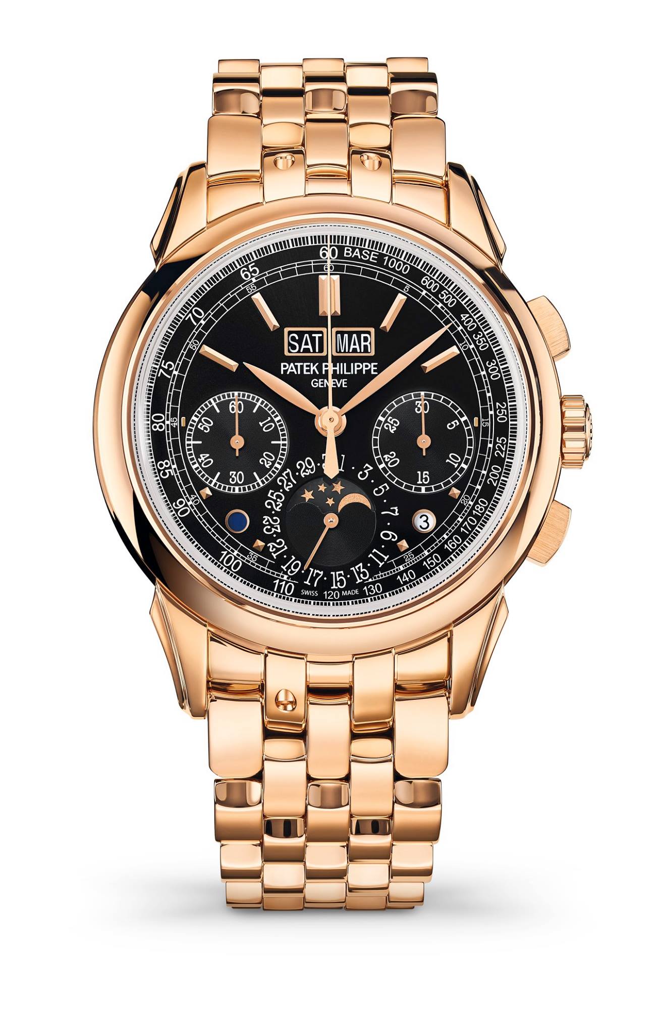 El apellido de la referencia 5270/1R-001 responde a la construcción de su caja y brazalete, que han echado mano de la mejor selección del oro rosa para vestir la muñeca del caballero con esa áurea majestuosidad. Su carátula, en color negro, destaca todas y cada una de las lecturas que se presentan producto del movimiento de cronógrafo con calendario perpetuo y remonte manual, es decir: horas, minutos, segundos, día, mes, fecha por aguja, día de la semana, indicador día/noche, fase de luna y año bisiesto. Adicional a las funciones del cronógrafo que dispone de subcarátulas para el contador de 30 minutos y un segundero permanente en punto de las 9 horas.