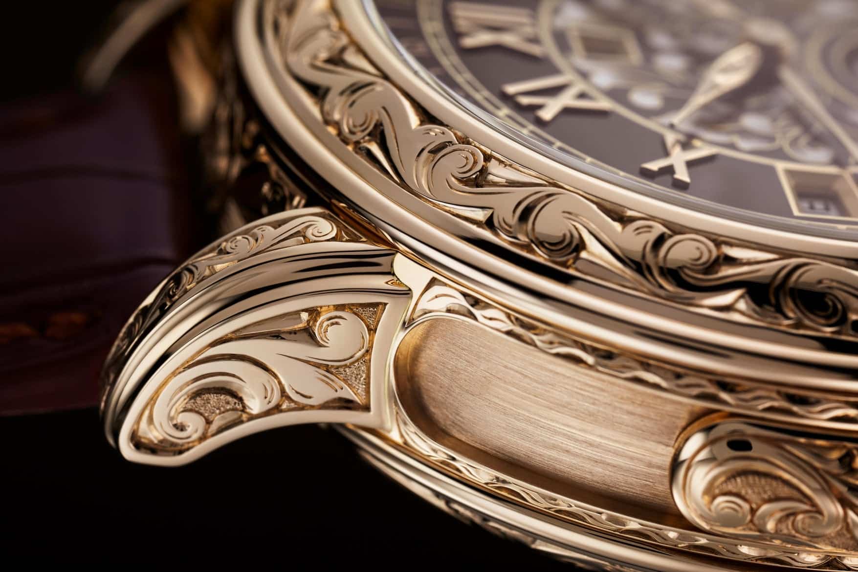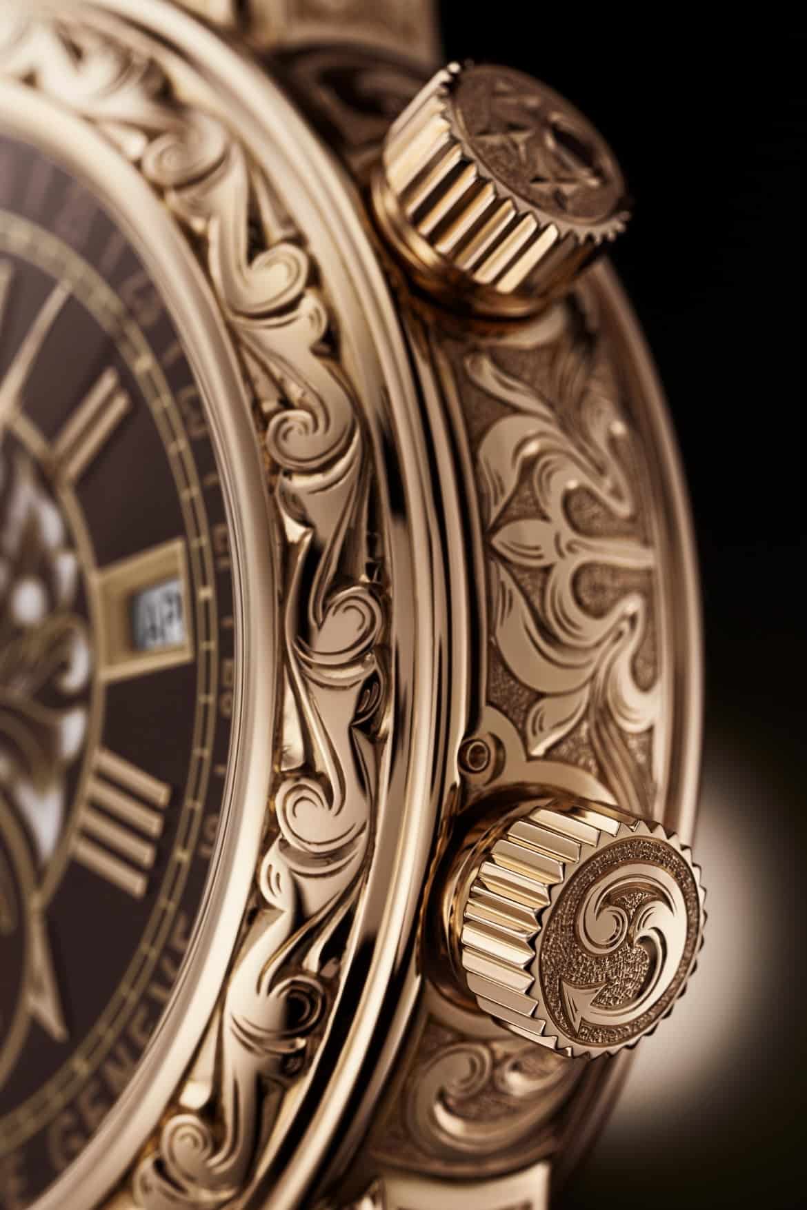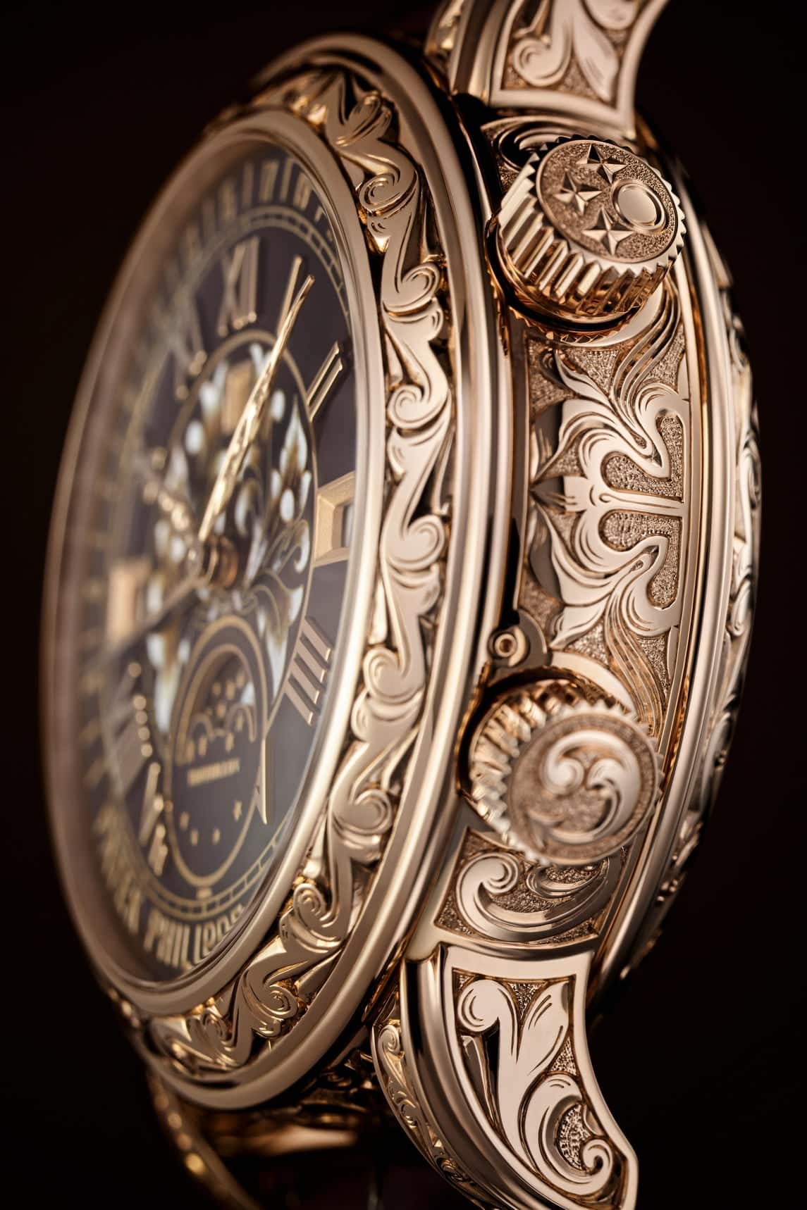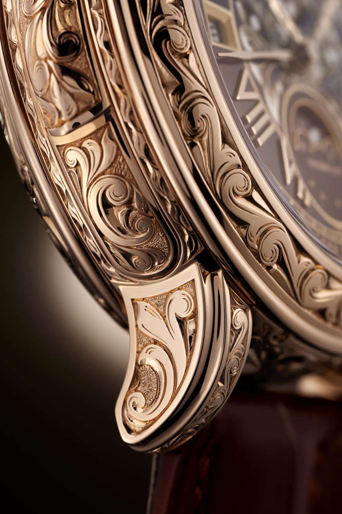 El grabado sigue siendo tan barroco en el nuevo Sky Moon Tourbillon como en el modelo saliente. Patek Philippe menciona que se necesitan unas 100 horas para realizar el grabado. La compleja articulación de cada superficie parece aún más pronunciada en el nuevo modelo, probablemente gracias al grado en que el oro rosa enfatiza los detalles y la geometría de la caja en comparación con el oro blanco.