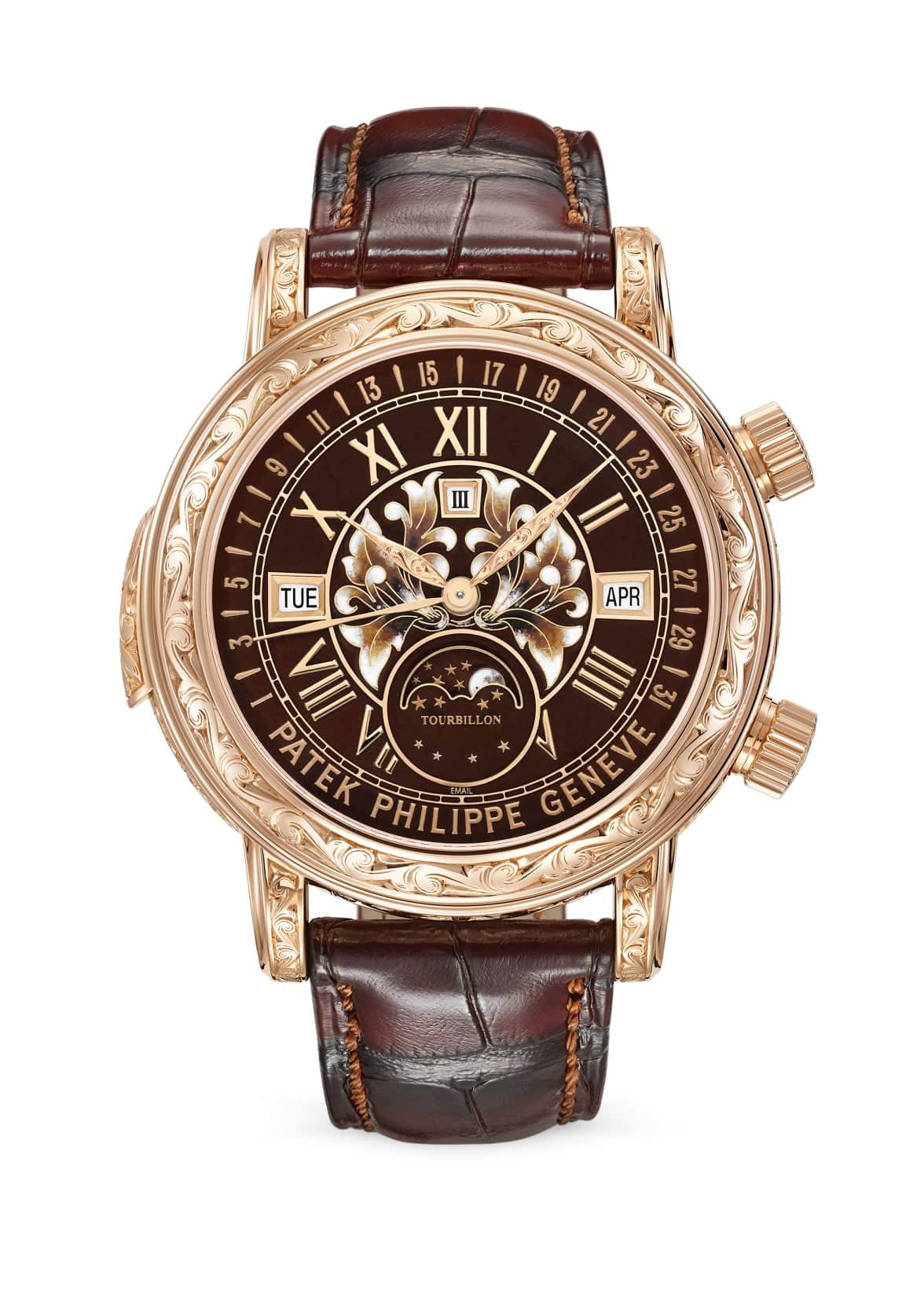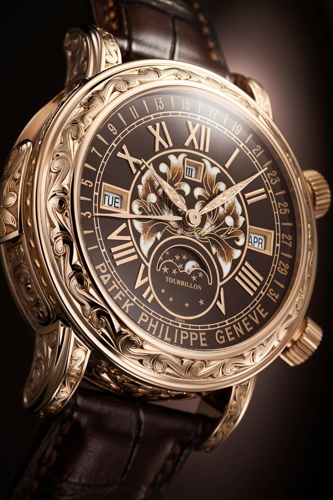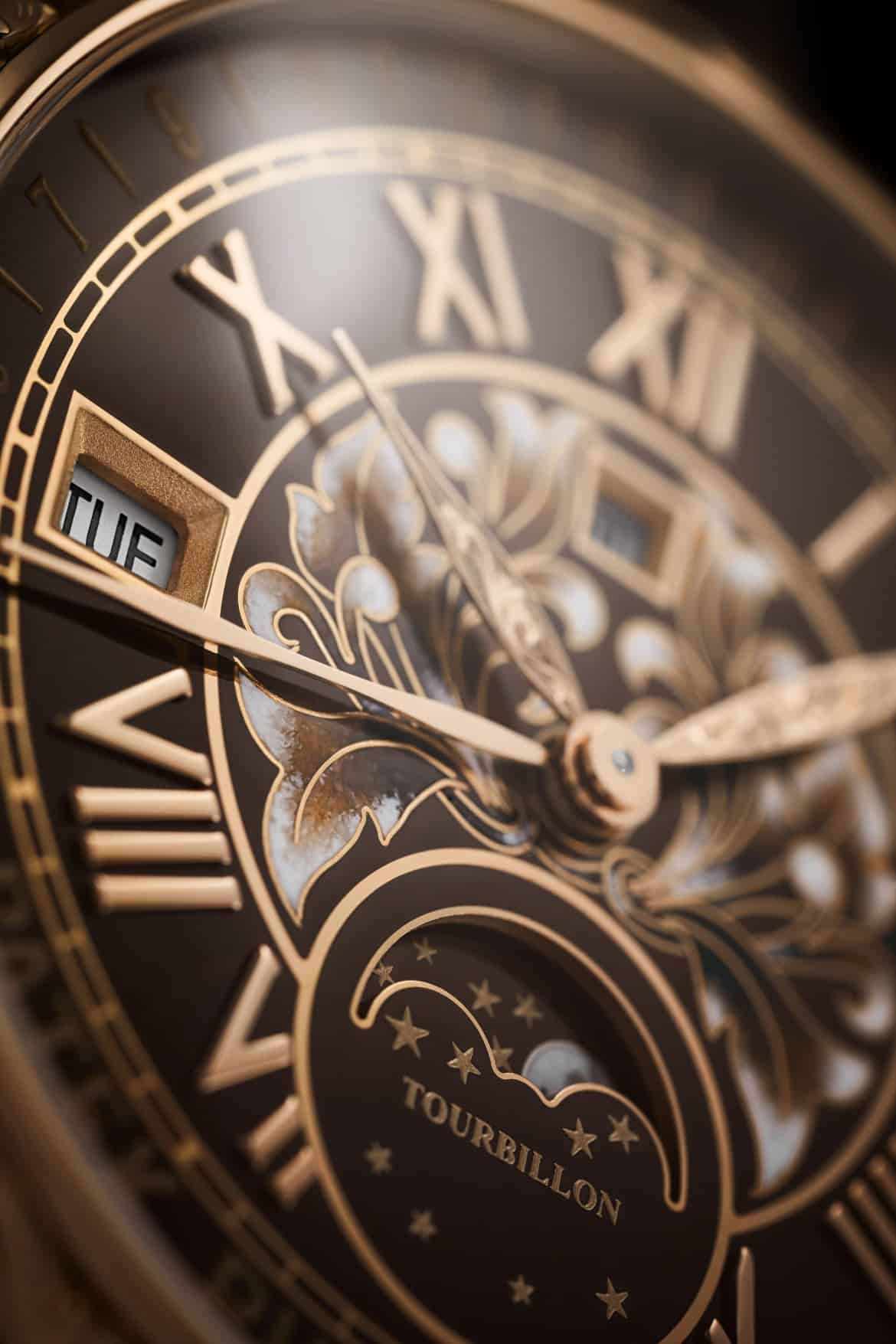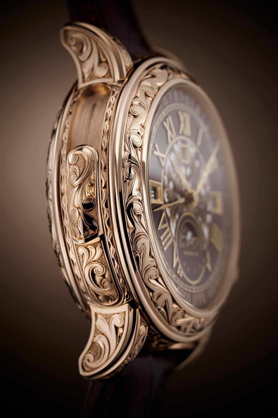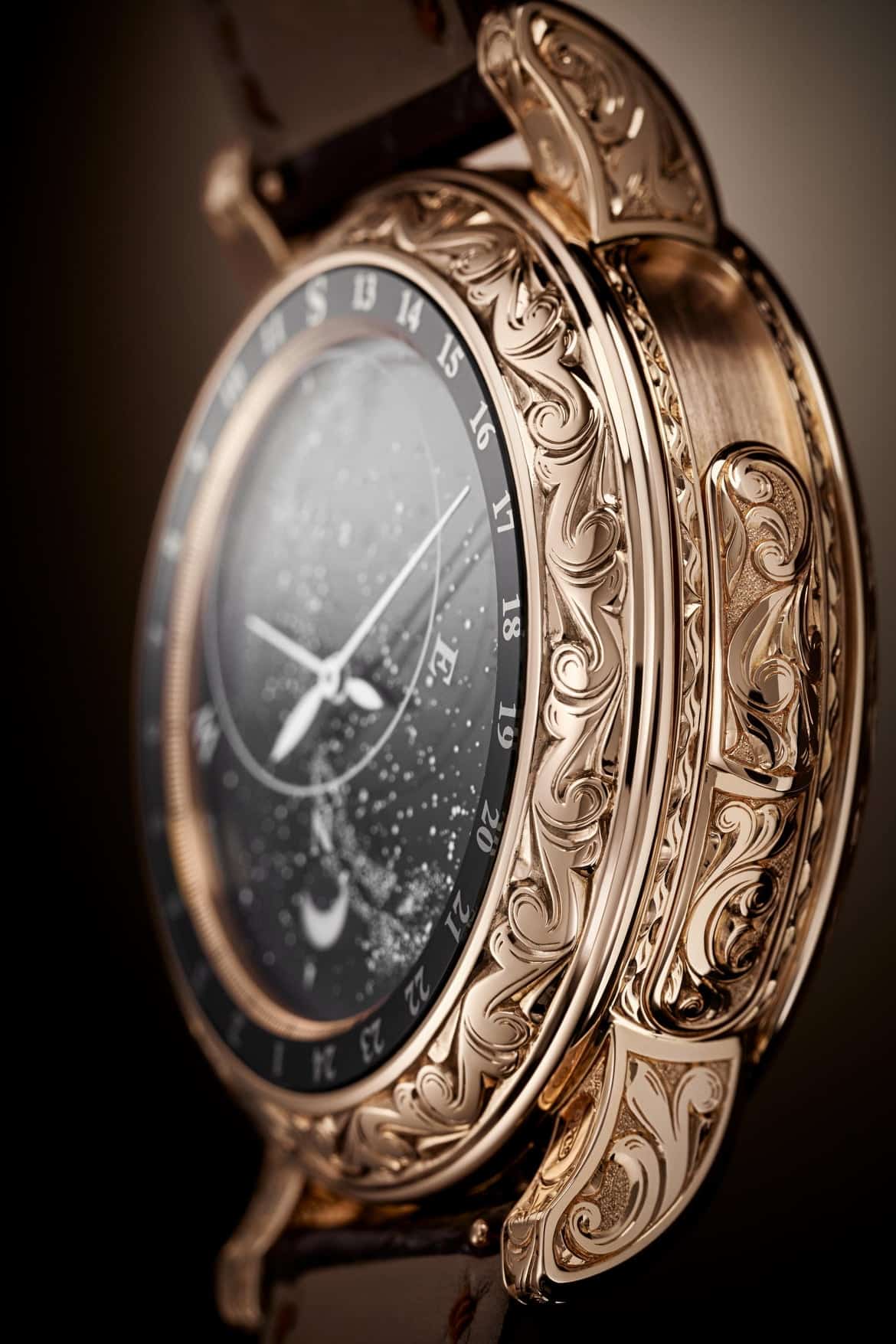 El grabado sigue siendo tan barroco en el nuevo Sky Moon Tourbillon como en el modelo saliente. Patek Philippe menciona que se necesitan unas 100 horas para realizar el grabado. La compleja articulación de cada superficie parece aún más pronunciada en el nuevo modelo, probablemente gracias al grado en que el oro rosa enfatiza los detalles y la geometría de la caja en comparación con el oro blanco.