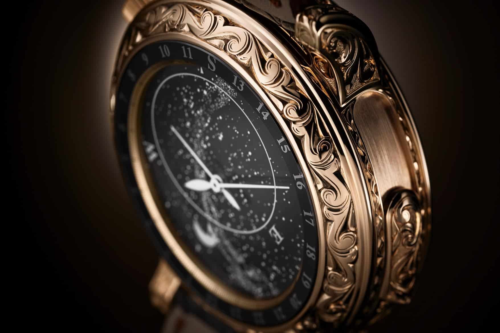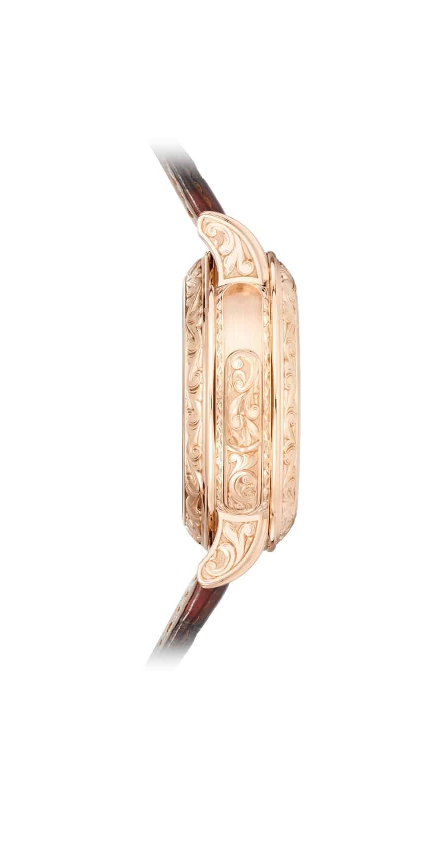 Completando las complicaciones está el repetidor de minutos, que se activa de forma tradicional, mediante un deslizamiento en el lateral de la caja. La versión anterior del Sky Moon Tourbillon era de oro blanco; el nuevo modelo es de oro rosa, pero duplica en gran medida los motivos grabados del modelo saliente. Además del grabado, también se utilizan un par de técnicas de esmaltado diferentes. La periferia de la carátula y la apertura de la fase lunar, así como el disco de la fase lunar, se realizan en una técnica llamada champlevé, en la que el metal se ahueca y luego se rellena con esmalte antes de la cocción. La parte interior de la carátula está decorada con esmalte cloisonné; esta técnica implica dar forma a un alambre de oro plano en varias formas y luego llenar las células resultantes con esmalte.
