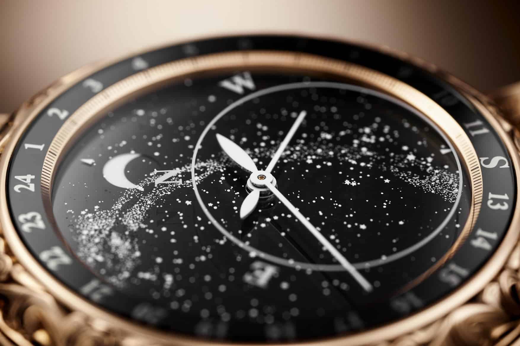 La parte posterior del reloj muestra las complicaciones astronómicas. Se ofrece el espectáculo de un cielo nocturno visto desde el hemisferio norte. La parte del cielo visible sobre el horizonte es la parte dentro del óvalo, con los puntos de la brújula mostrados también, para orientarlo. También se muestran la órbita y la fase de la Luna. Las dos manecillas muestran el tiempo sidéreo.