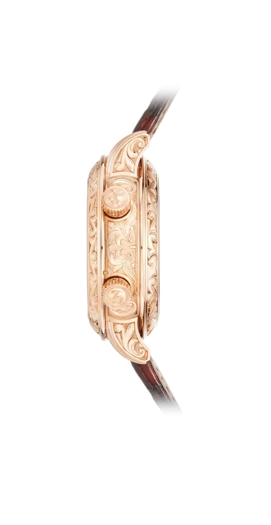 - Caja: 44 x 17.35 mm de oro rosa de 18 quilates con grabado especial; cristal de zafiro en ambas caras funcionales, coronas a juego y gatillo de repetición igualmente grabado