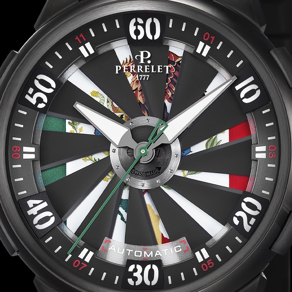 Estas piezas reúnen lo mejor de Perrelet, al integrar la tecnología patentada de doble rotor y turbina, con sus icónicas 12 aspas giratorias de aluminio anonizado negro; y lo mejor de la tradición mexicana, con carátulas de la bandera de México y los cráneos decorados del Día de Muertos.