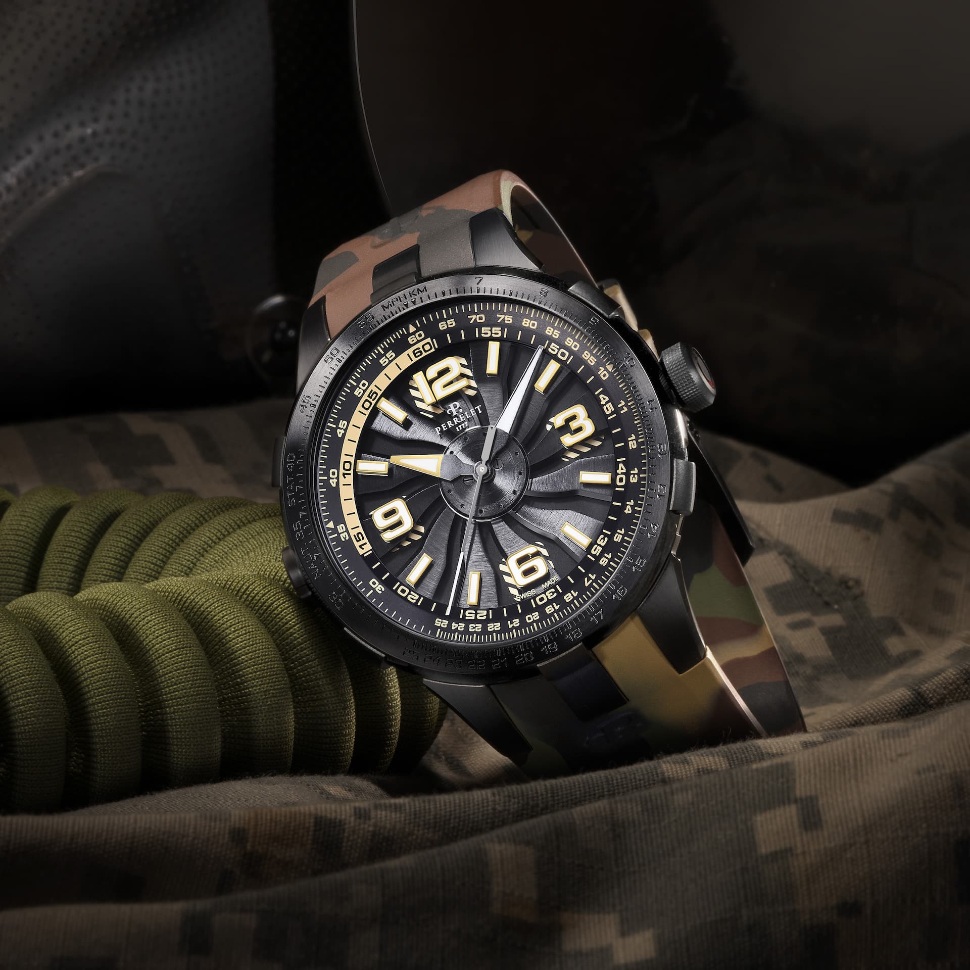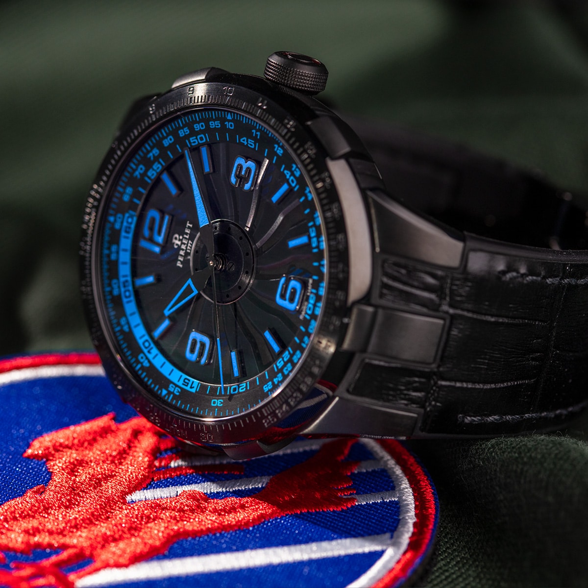 Pero no solo son los colores lo que se destaca de inmediato en la carátula de los Perrelet Turbine Pilot. Gracias a su robusta caja de 48 mm en acero inoxidable con tratamiento PVD negro, observamos un espectáculo visual como ningún otro. Primero está la cuestión funcional. En la periferia vemos las escalas graduadas de la regla de cálculo, manipulable desde la corona. Las reglas de cálculo de la aviación son herramientas de cálculo analógicas que apoyan a los pilotos durante el vuelo. Las computadoras pueden hacer estas operaciones, pero una regla de cálculo es una oportunidad única de interactuar con el reloj.