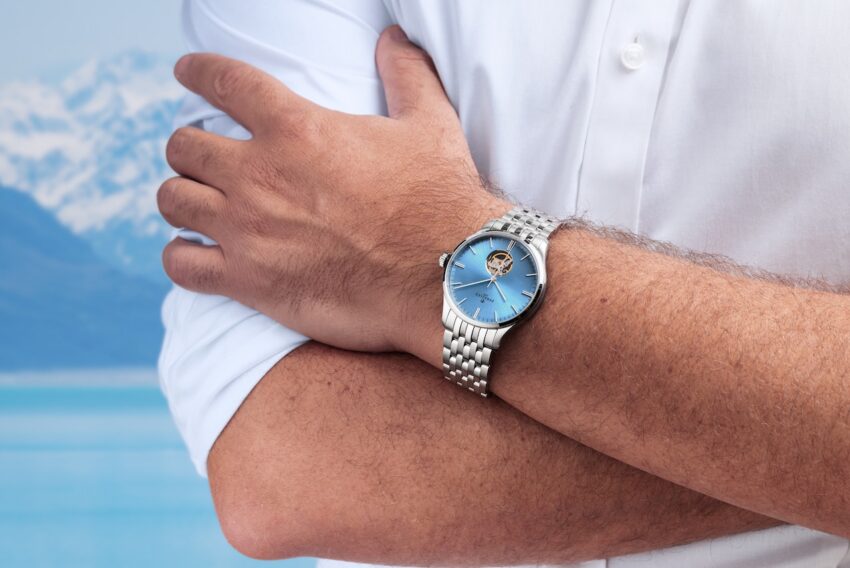 Como mencionamos, a partir de ahora Weekend se puede encontrar con esferas Azul Glaciar (Ice Blue). Este refrescante color se une a las otras opciones más tradicionales de la línea –azul oscuro, plata y negro–, sin olvidar el trendy verde inglés. El tono Ice Blue recuerda el distintivo color azul presente en las profundidades de los glaciares, las capas heladas de los bosques de pinos y las nubes de invierno. En cromoterapia, tiene un efecto relajante, calma el estrés e inspira serenidad. Gracias al acabado soleado de la carátula abombada, el tono se enriquece con reflejos irisados dependiendo el ángulo de la luz al momento de observarla.