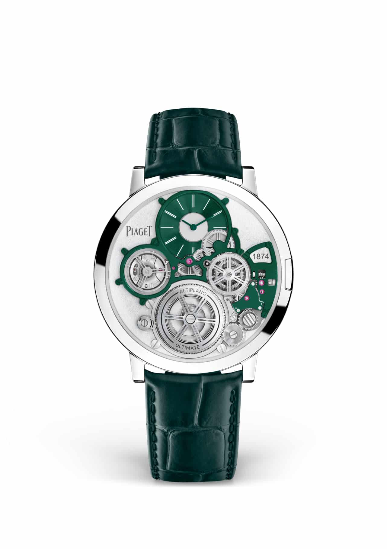 El Altiplano Ultimate Concept, homenaje a La Côte-aux-Fées tiene un puente, tornillos, manecillas y una carátula en un verde bosque profundo y complementado con una correa a juego en piel de aligátor. La caja de aleación de cobalto altamente pulida contrasta maravillosamente con la riqueza de los detalles verdes, evocando la sensación de un típico día de primavera o verano en las colinas y campos alrededor del pueblo que ha sido el hogar de Piaget durante casi 150 años. Y, como recordatorio, la placa principal está grabada sutilmente con el año de fundación de la empresa, 1874.