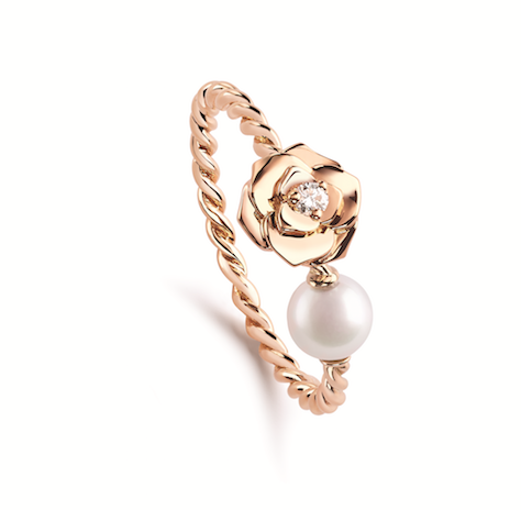 Un hermoso collar del que cuelga una sutil rosa con engaste de diamante talla brillante de 0,03 quilates, unos pendientes en oro rosa y un anillo con una perla Akoya iridiscente, son sin duda, uno de los mejores detalles que se ajustaran a la perfección de una mujer delicada y bella.